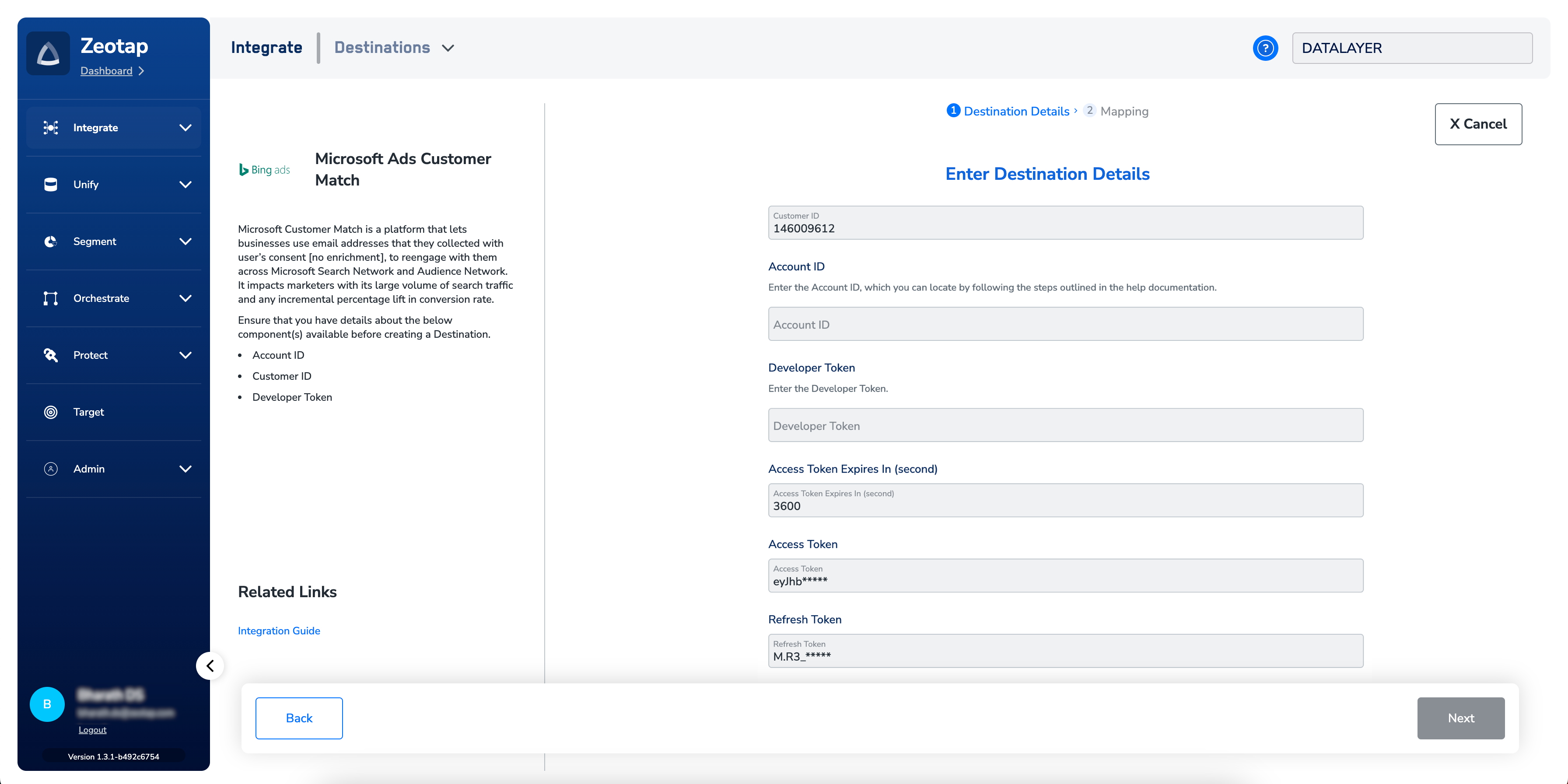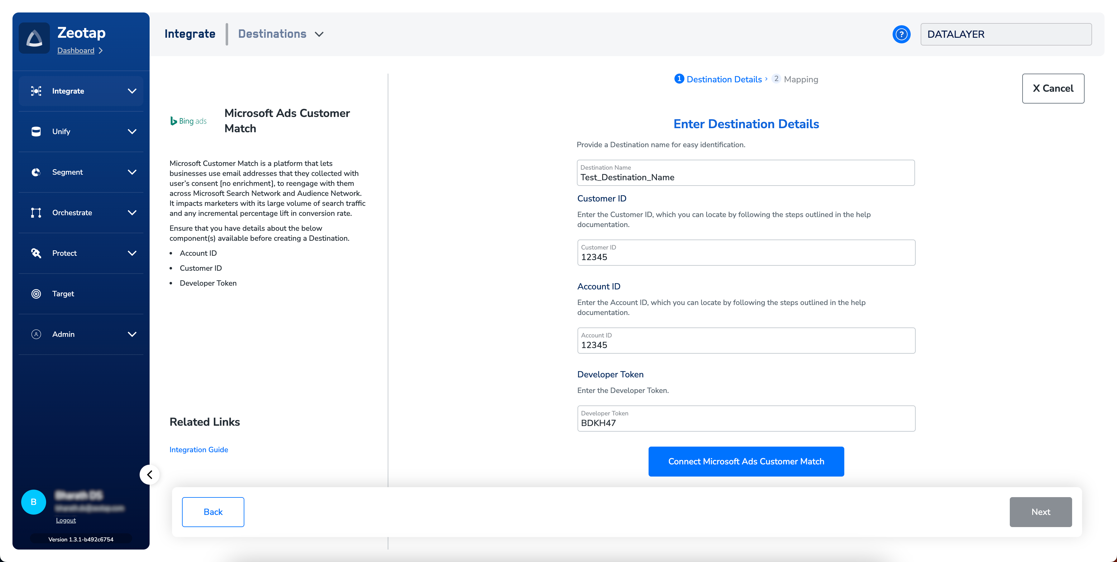 To use the Microsoft Ads Customer Match APIs, you must have a Developer token and valid Super Admin credentials. For information on how to get a Developer token, refer here.Create a Destination for Microsoft Ads Customer Match