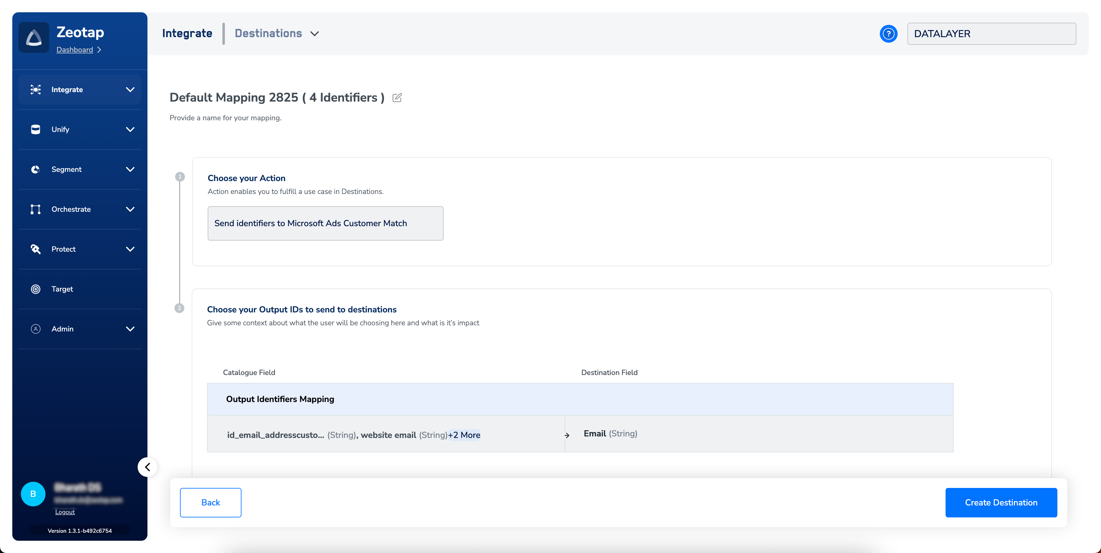 In the new screen that appears, choose the appropriate Action and mapping as explained below.a. Choose the desired action under Choose your Action and then choose the corresponding identifiers under Map the Fields. By default, the Output Identifiers that are accepted by the platform such as, MAIDs, Cookies, email Ids and more are displayed. However, you can edit, add or remove an identifier from the list. To do so, refer here.b. Click Create Destination. The created Destination gets listed in the Audiences application, which can be linked to an Audience/segment.