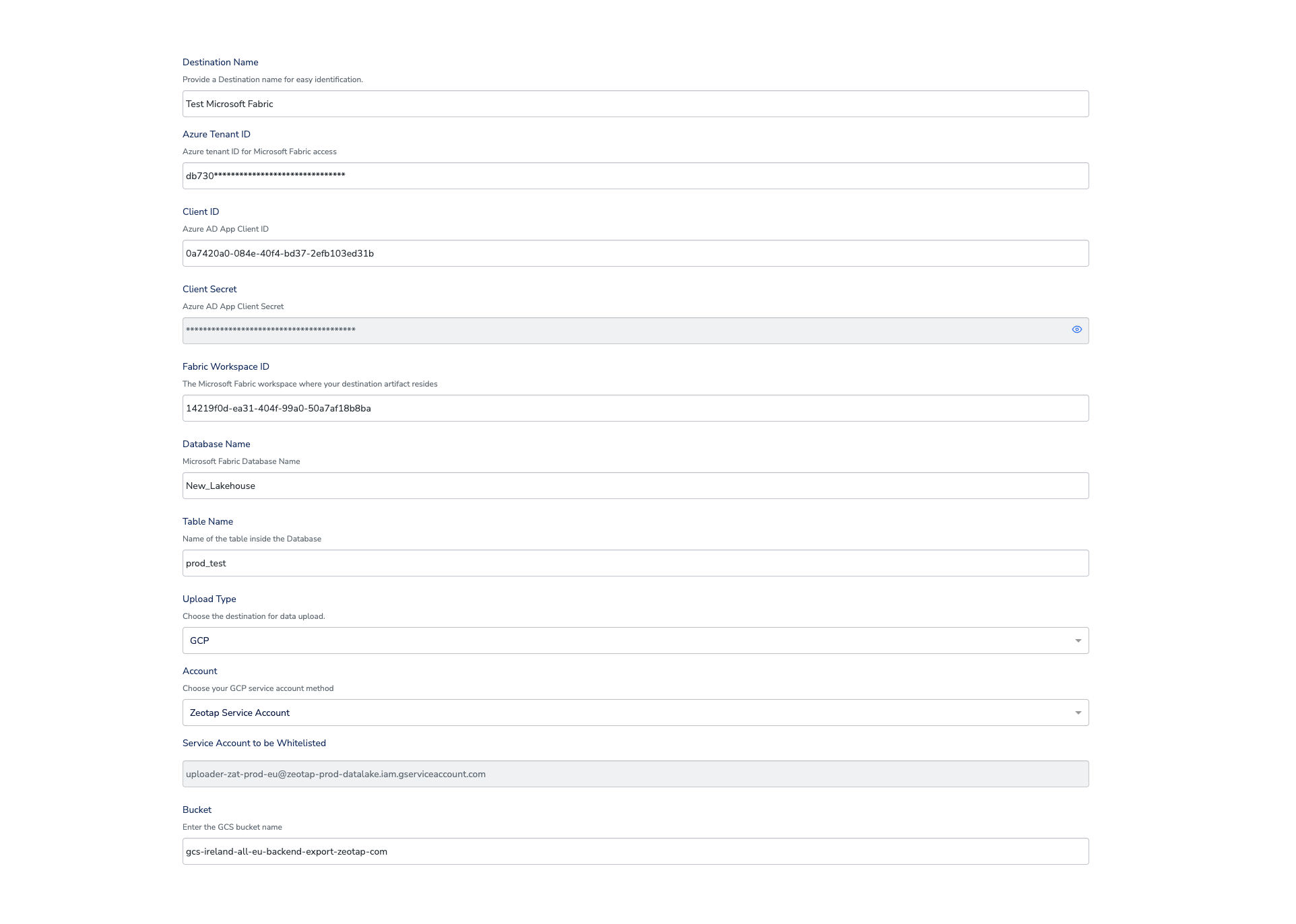 Perform the following steps to create a Destination for Microsoft Fabric:Click Microsoft Fabric. A screen appears displaying details about the particular destination towards the left. On the right-hand side of the screen find a list of fields that are required for the integration to be established. Provide the required details as mentioned in the following steps:a. Enter a name for the Destination.b. In the Azure Tenant ID field, provide the Azure tenant ID.c. Enter Client ID and Client Secret that you generated using the steps in the Authentication section.d. Enter the Fabric Workspace ID, Database Name, and Table Name of Microsoft Fabric where you want to push the data from Zeotap.e. Select the Upload Type. Currently only uploading to GCS is supported.f. Under Account, choose either Zeotap Service Account or Client Service Account Json using the drop-down menu based on the type of authentication you need. If you wish to use Zeotap Service Account, then ensure that you whitelist this it to push audiences (segments) from Zeotap CDP to Google Cloud Storage Platform.