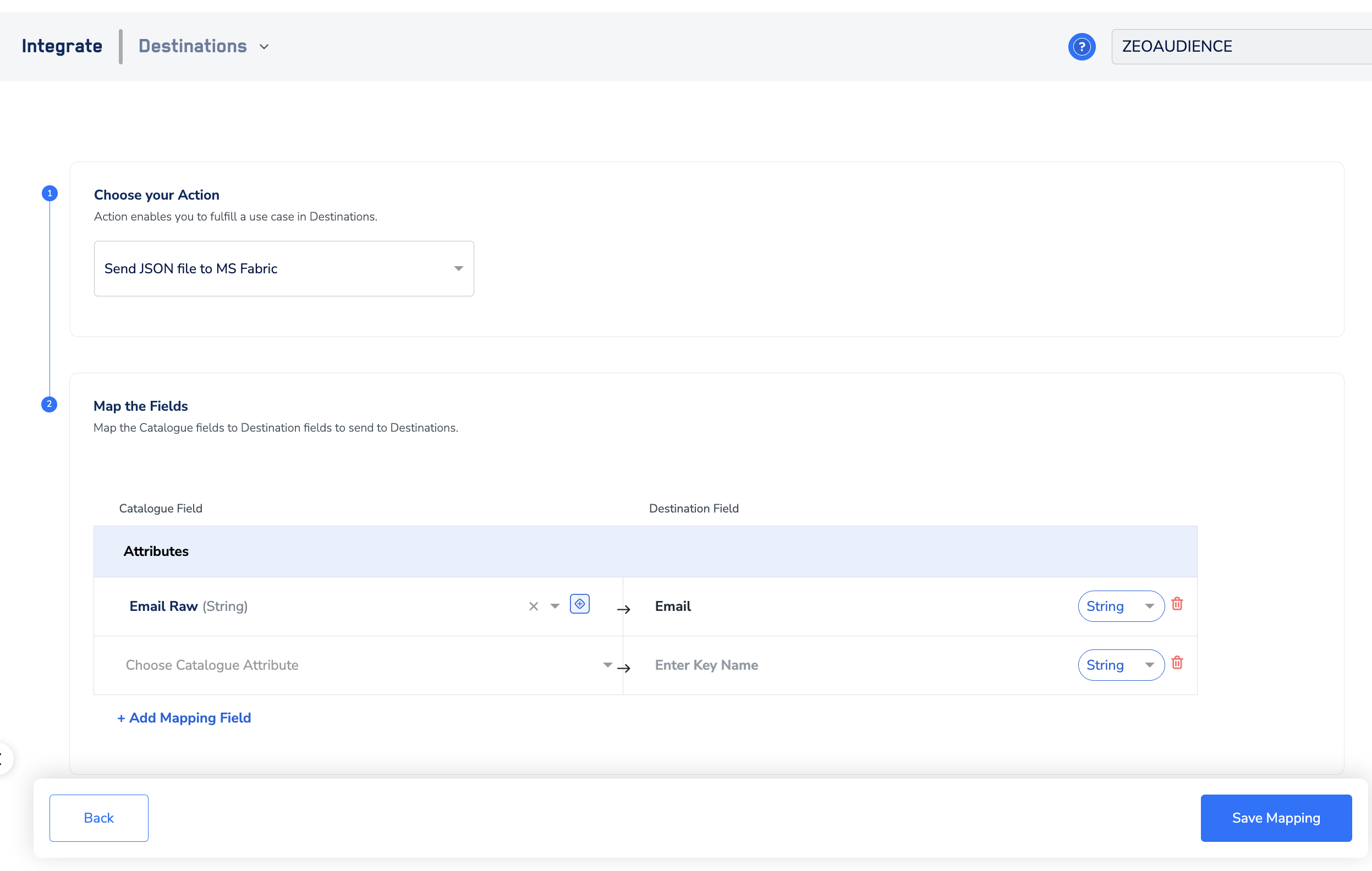 In the new screen that appears, choose the appropriate action and mapping as explained below. Under Choose your Action, you can choose Send Json File to MS Fabric action.a. Click on + Add mapping field and add the fields you want to send. The names in the Destination field (RHS) appears as the names of the columns in your Microsoft Fabric instance.b.