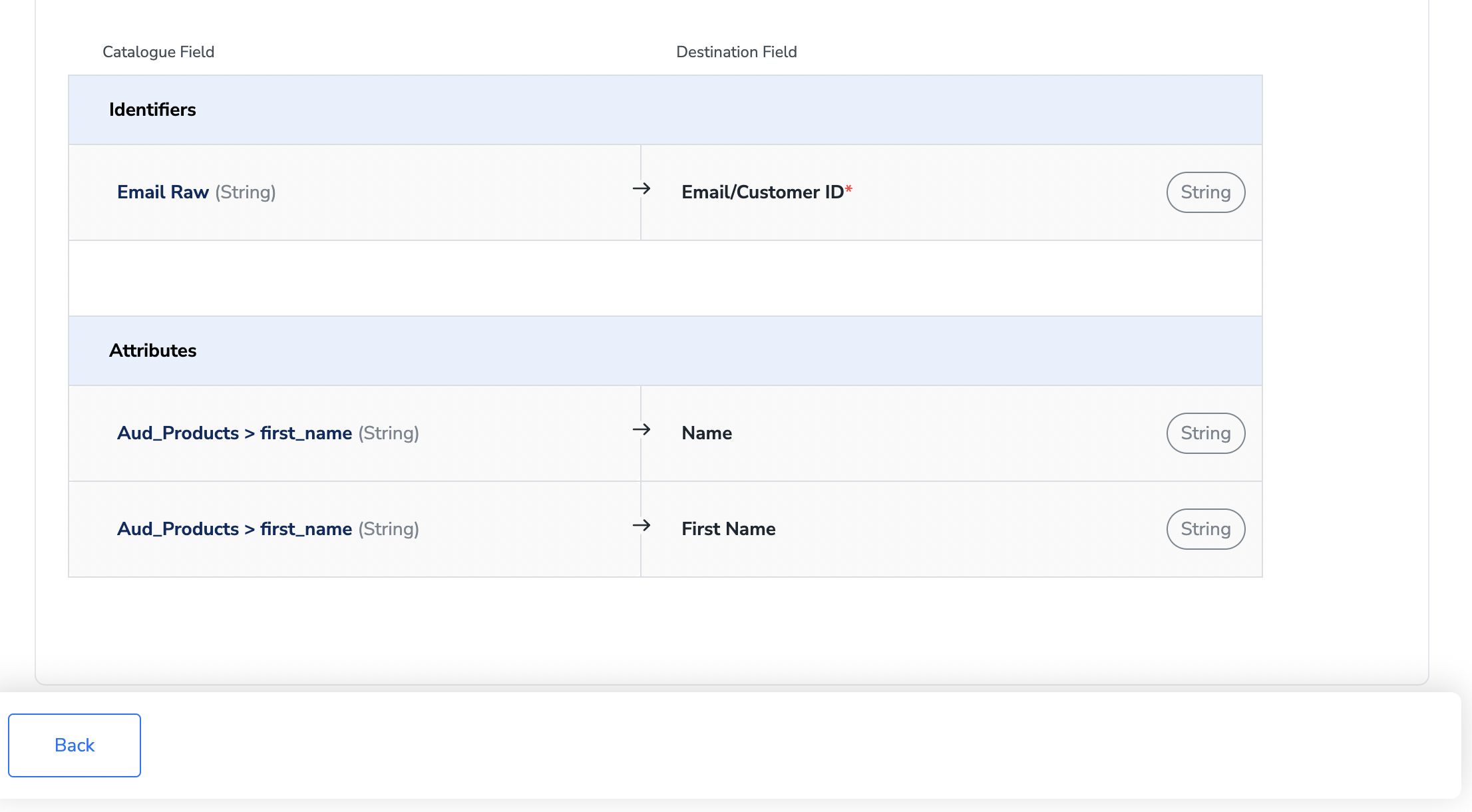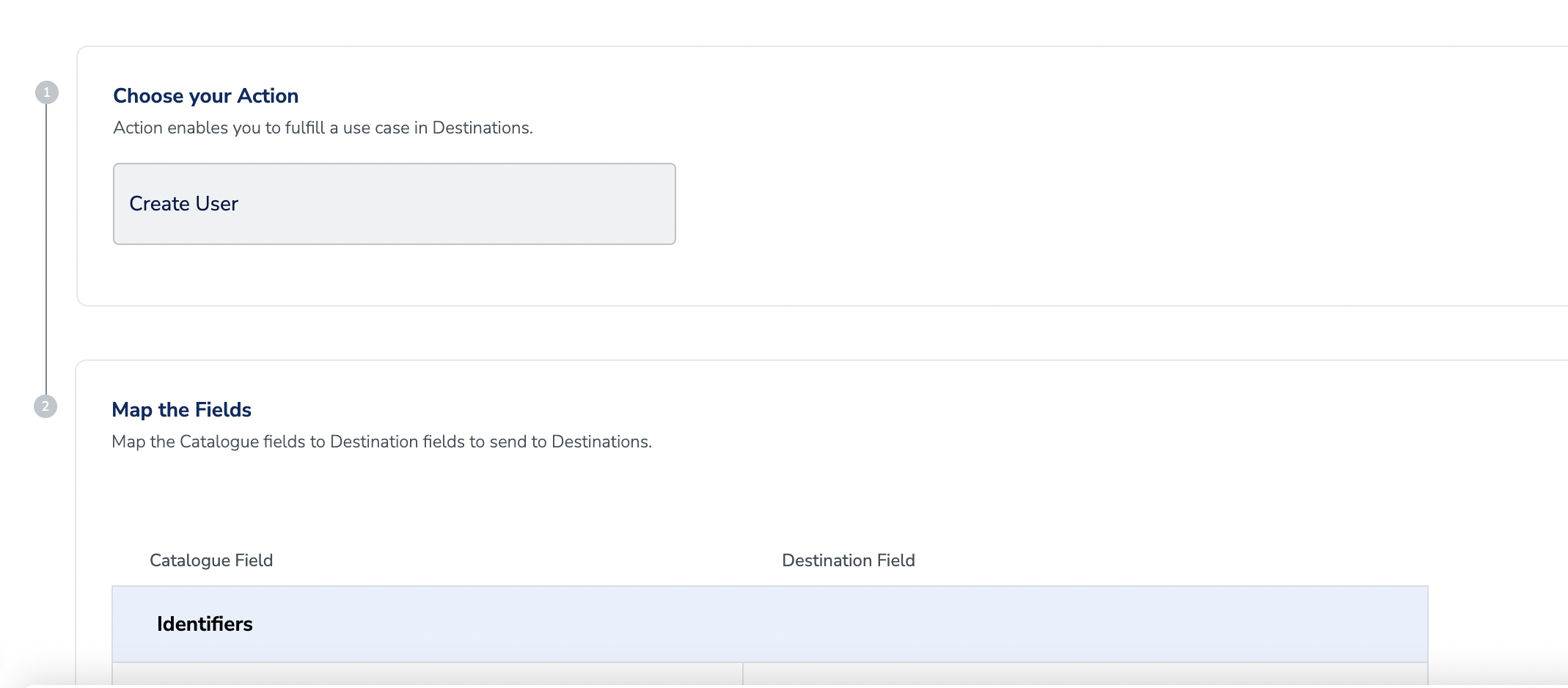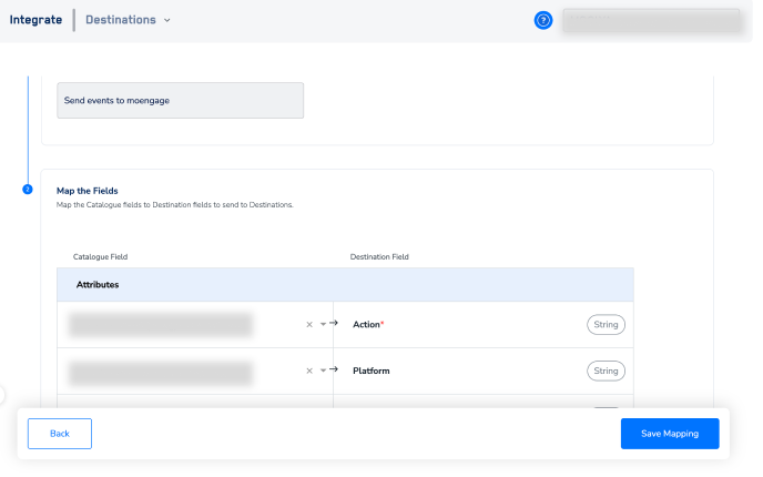 In the new screen that appears, choose the appropriateaction and mapping as explained below. Under Choose your Action, choose Sync User/Send Events as the action.You can map the following fieldsi. User ID/Emailii. Name, First Name and any other custom field using the +Add Mapping buttoniii. Action/Event Name and Action Attributes/Event Attributes related to the event. (Only for Send Events Action)