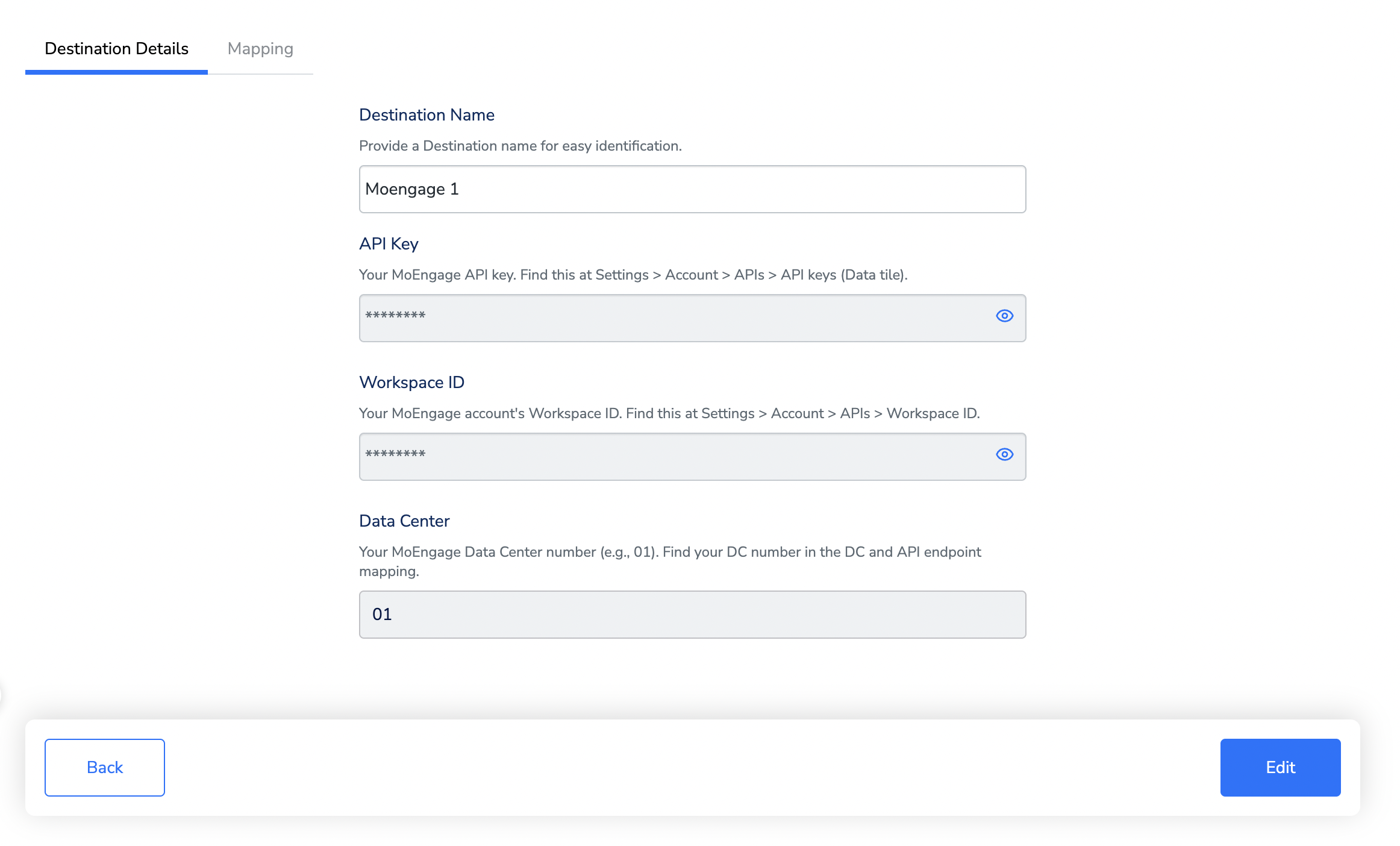 Perform the following steps to create a Destination for Moengage:Click Moengage. A screen appears displaying details about the particular destination towards the left. On the right-hand side of the screen find a list of fields that are required for the integration to be established. Enter the required details as mentioned in the following steps:a. Enter a name for the Destination.