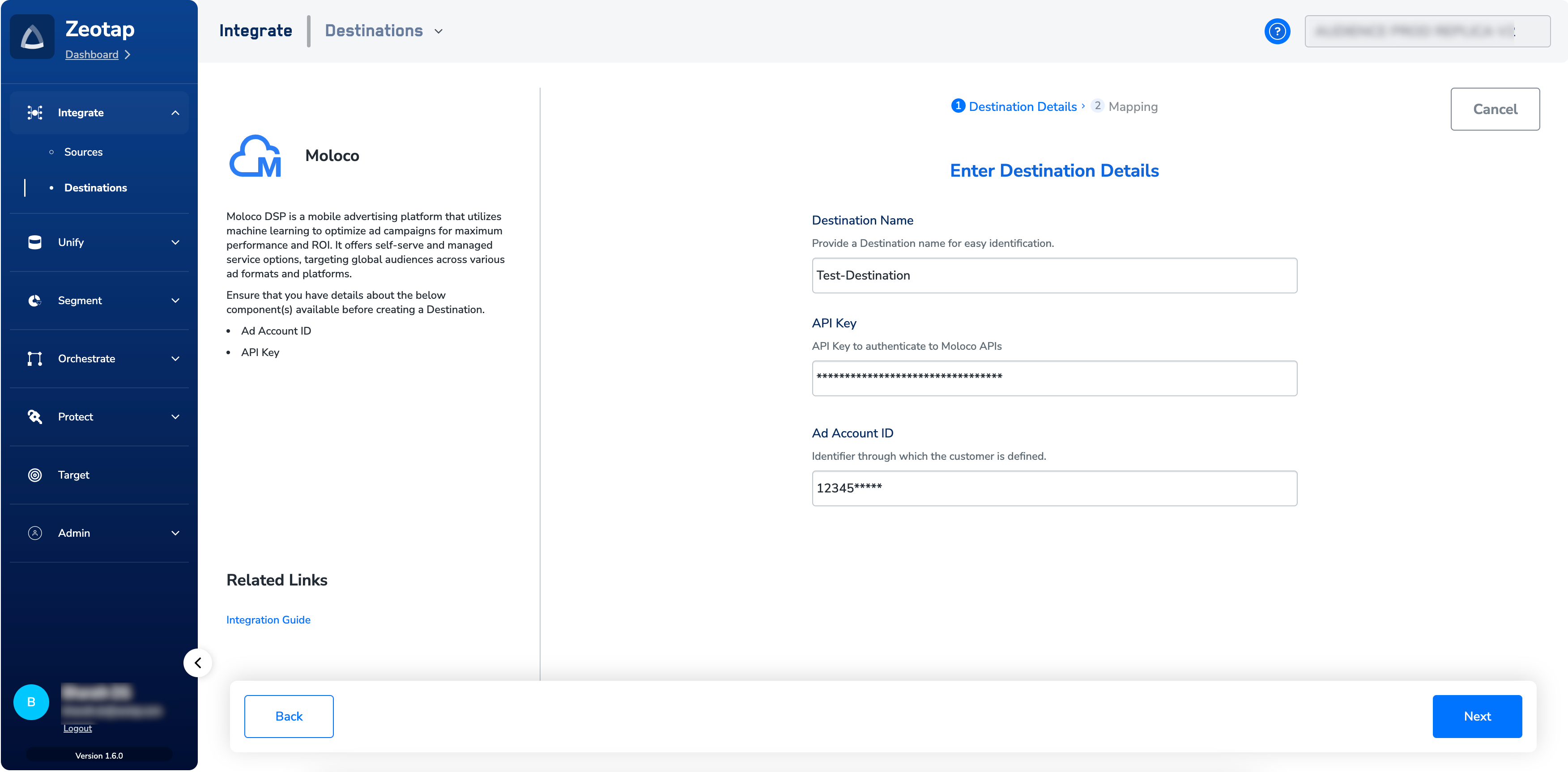 Perform the following steps to create a Destination for Moloco:Click Moloco. A screen appears displaying details about the particular destination towards the left. On the right-hand side of the screen find a list of fields that are required for the integration to be established. Enter the required details as mentioned in the following steps:a. Enter a descriptive name for the Destination.b. Enter the API Key associated with your Moloco account.c. Enter the Ad Account ID obtained from your Moloco account.d. Review all the values entered above and then click Next to proceed.