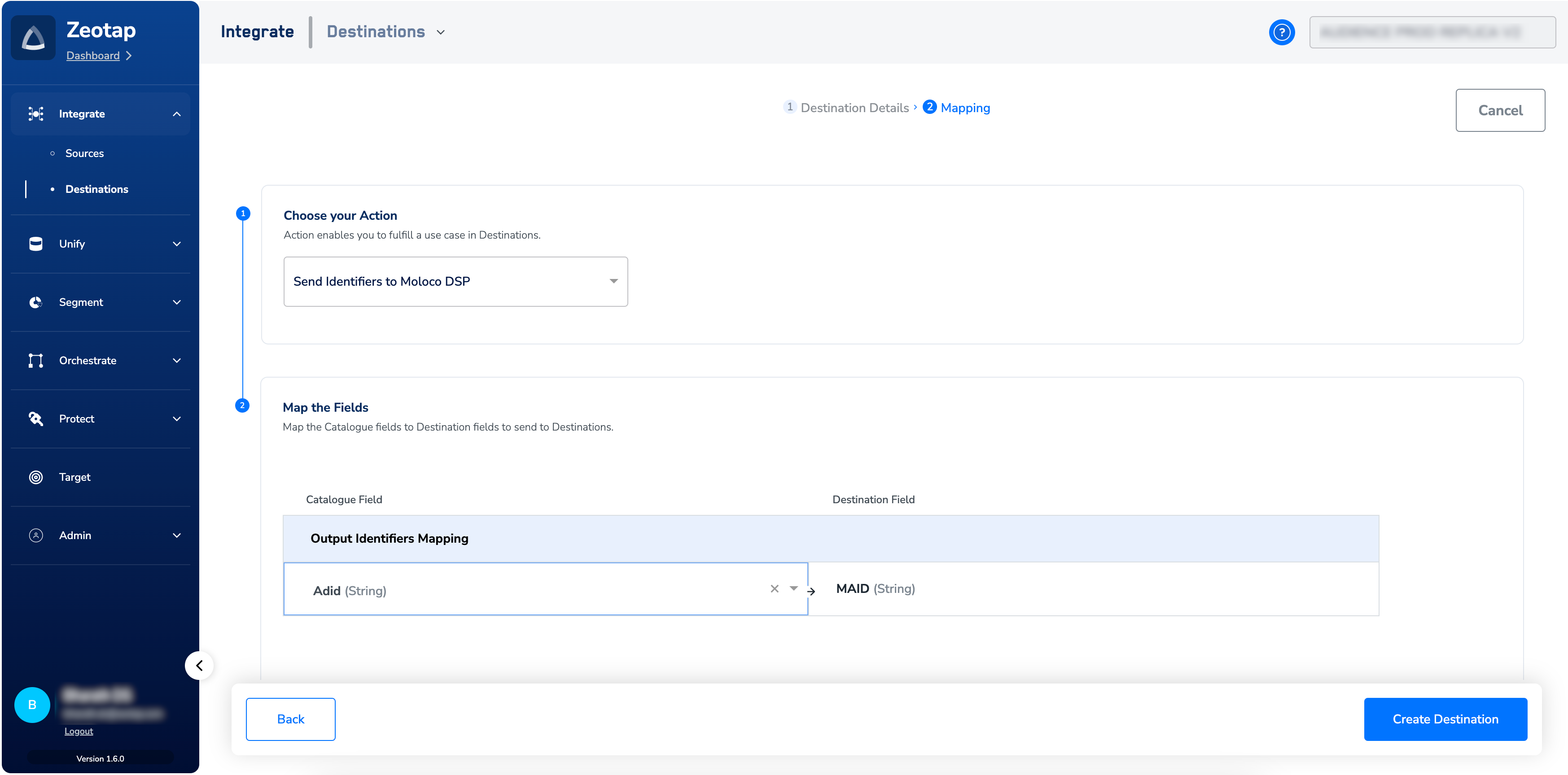 In the new screen that appears, under Choose your Action, select Send Identifiers to Moloco DSP as the action for activating your audience (segment) on the Audiences module. Under Map the Fields, you can map the desired output identifier to MAID.