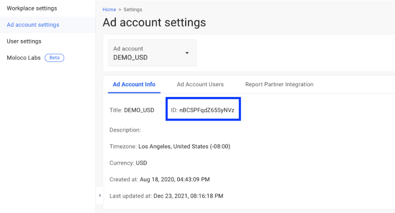 This is the Ad Account ID associated with the Moloco DSP account. It serves as a modifier to authenticate and authorize specific ad operations within Moloco’s platform. To obtain this information, log into Moloco Ads and click Ad account settings below your profile. Under the Ad Account Info tab, you can find your Ad Account ID as shown in the image below.