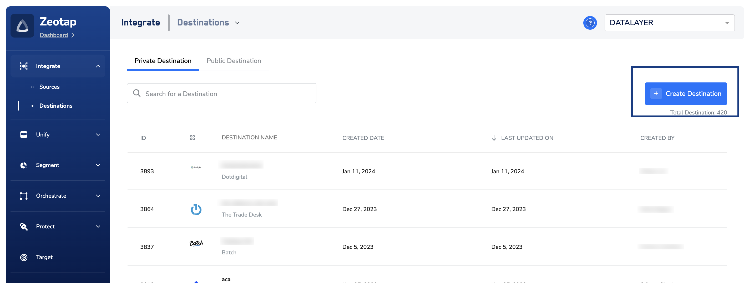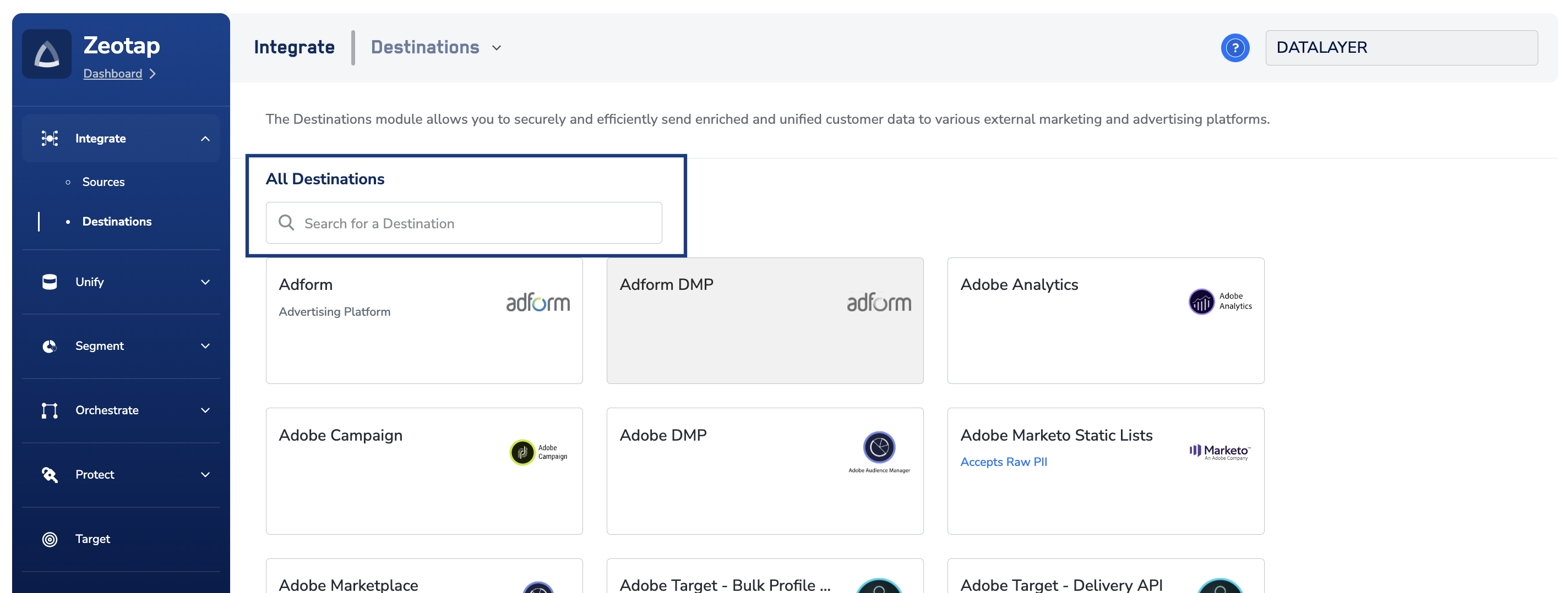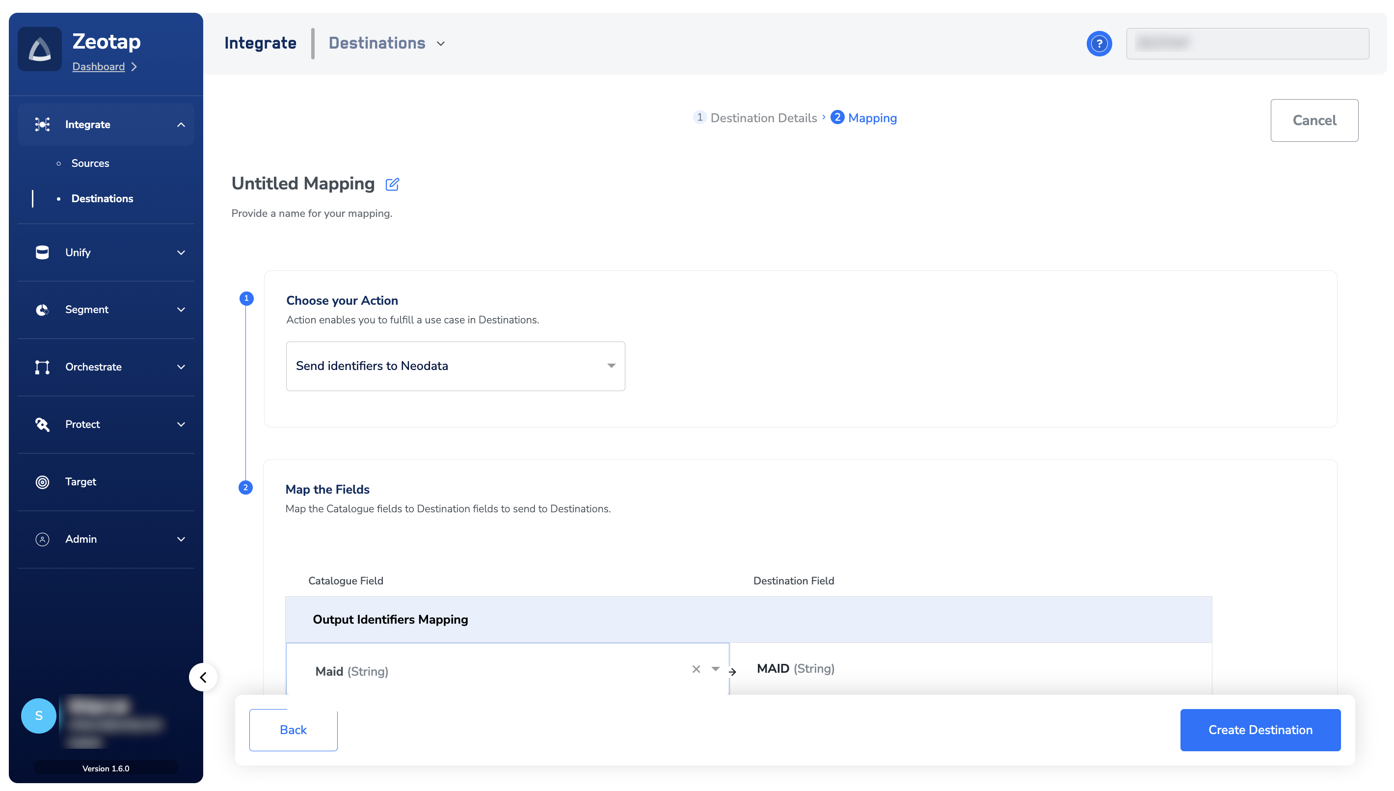 In the new screen that appears, choose the appropriate Action and Mapping as explained below.a. Choose the desired action under Choose your Action and then choose the corresponding identifiers under Map the Fields. By default, the Output Identifiers that are accepted by the platform such as MAIDs, Cookies and more are displayed. However, you can edit, add or remove an identifier from the list. To do so, refer here.b. Click Create Destination. The created Destination gets listed in the Audience and Target applications, which can be linked to an Audience/segment.