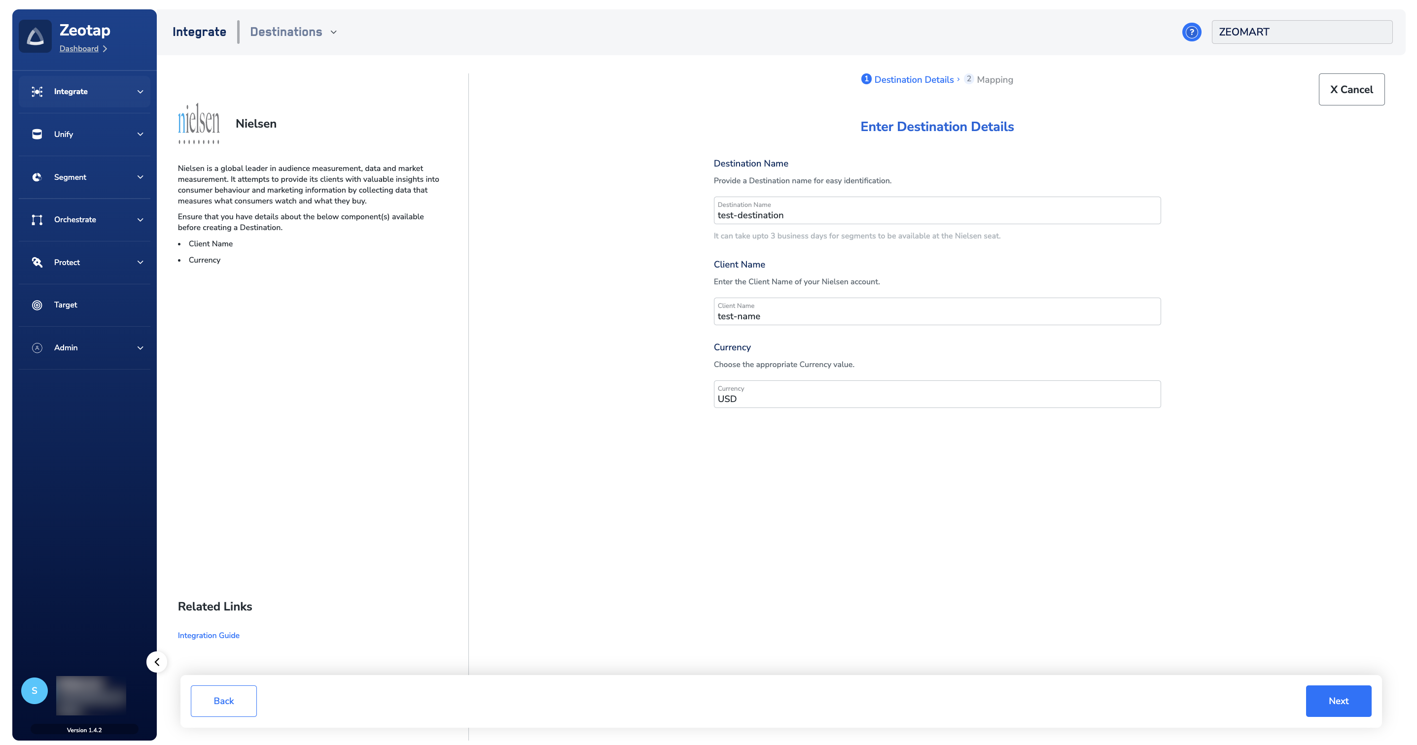 Perform the following steps to create a Destination for Nielsen:Click Nielsen. A screen appears displaying details about the particular destination towards the left. On the right-hand side of the screen find a list of fields that are required for the integration to be established. Enter the required details as mentioned in the following steps:a. Enter a name for the Destination.b. Enter the Client Name.c. By default, USD is selected as Currency.d. Review all the values entered above and then click Next to proceed.