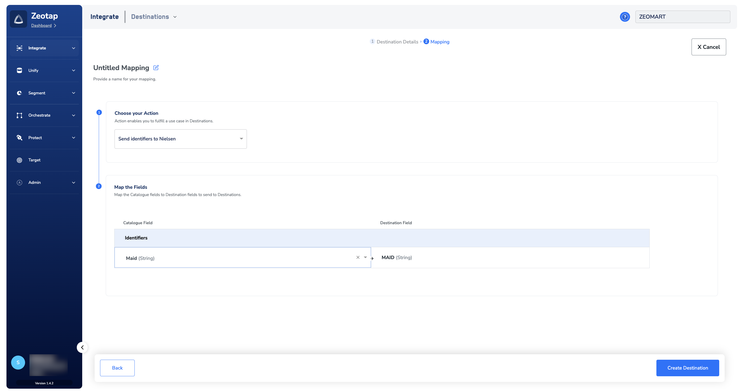 In the new screen that appears, choose the appropriate action and mapping as explained below.a. Choose the desired action under Choose your Action and then choose the corresponding identifiers under Map the Fields. By default, the Output Identifiers that are accepted by the platform such as, MAIDs, Cookies, email Ids and more are displayed. However, you can edit, add or remove an identifier from the list. To do so, refer here.b. Click Create Destination. The created Destination gets listed in the Target application, which can be linked to an Audience/segment.