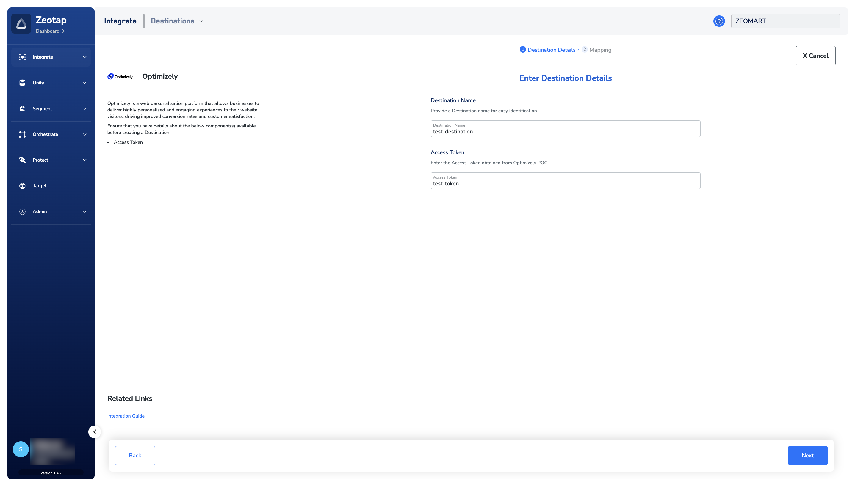 Perform the following steps to create a Destination for Optimizely:Click Optimizely. A screen appears displaying details about the particular destination towards the left. On the right-hand side of the screen find a list of fields that are required for the integration to be established. Enter the required details as mentioned in the following steps:a. Enter a name for the Destination.b. Enter the Access Token that you have obtained from Optimizely.c. Review all the values entered above and then click Next to proceed.