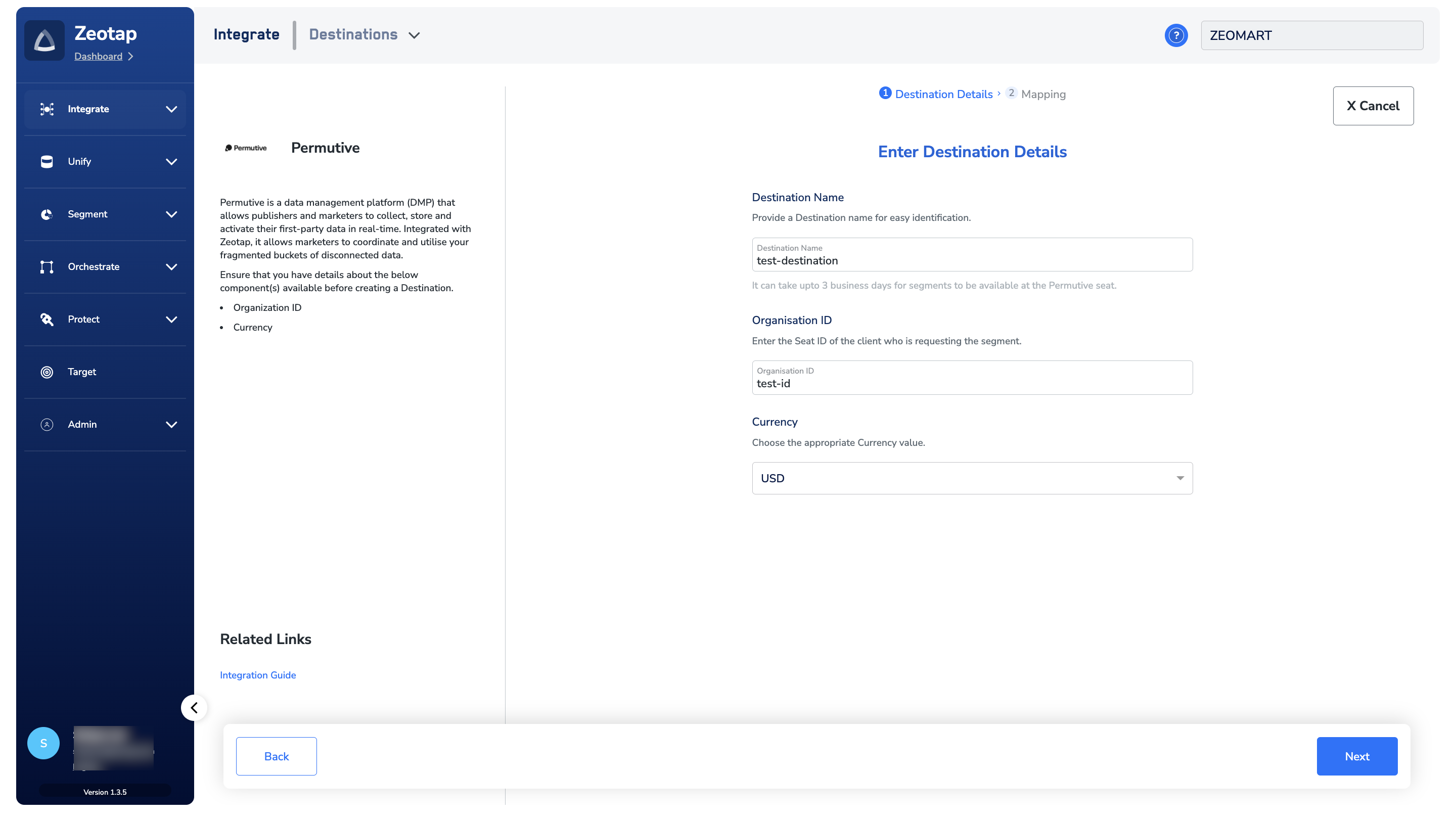 Perform the following steps to create a Destination for Permutive:Click Permutive. A screen appears displaying details about the particular destination towards the left. On the right-hand side of the screen find a list of fields that are required for the integration to be established. Enter the required details as mentioned in the following steps:a. Enter a name for the Destination.b. Enter the Publisher’s Permutive Organization ID.c. Select the appropriate Currency value from the drop-down menu.d. Review all the values entered above and then click Next to proceed.