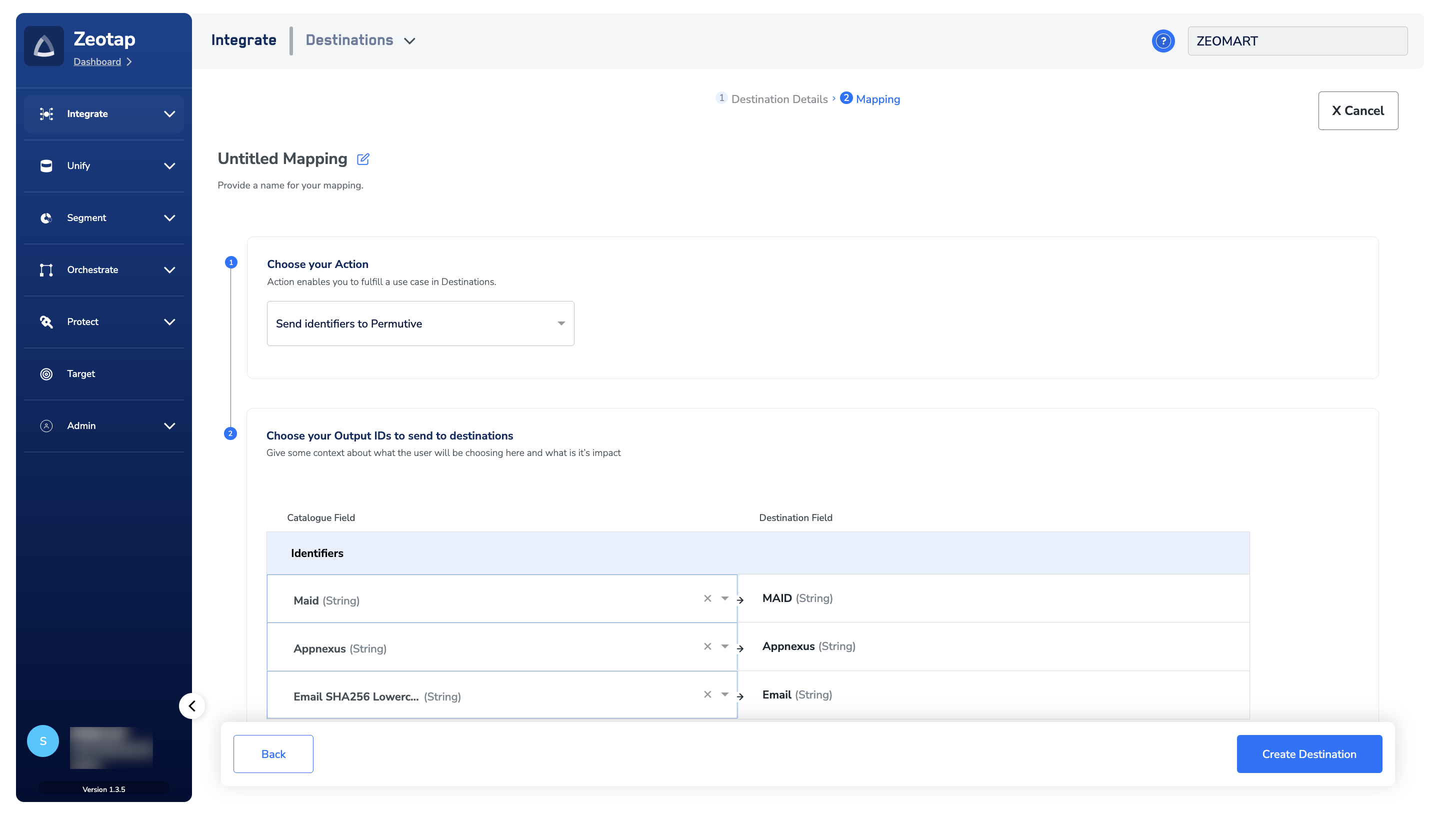 In the new screen that appears, choose the appropriate action and mapping as explained below.a. Choose the desired action under Choose your Action and then choose the corresponding identifiers under Map the Fields. By default, the Output Identifiers that are accepted by the platform such as, MAIDs, Cookies, email Ids and more are displayed. However, you can edit, add or remove an identifier from the list. To do so, refer here.b. Click Create Destination. The created Destination gets listed in the Target and Audiences applications, which can be linked to an Audience/segment.
