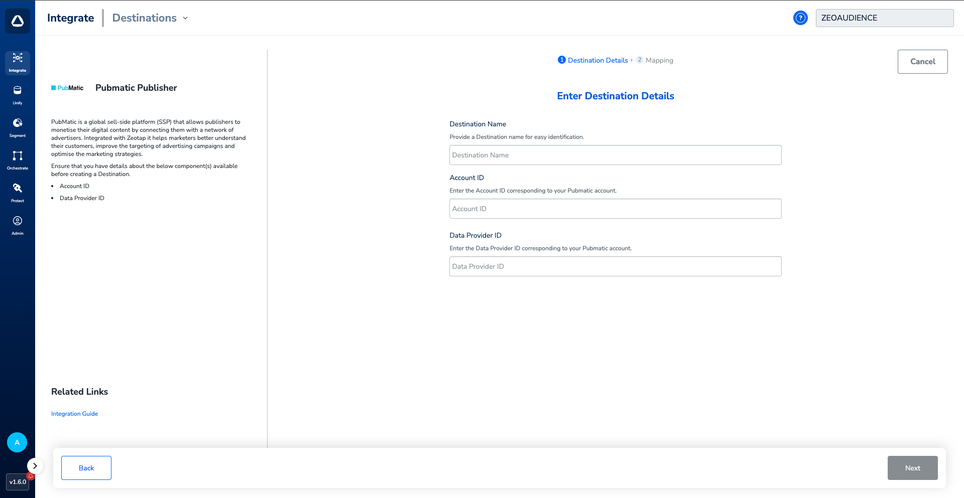 Perform the following steps to create a Destination for PubMatic Publisher:Click PubMatic Publisher. A screen appears displaying details about the particular destination towards the left. On the right-hand side of the screen find a list of fields that are required for the integration to be established. Enter the required details as mentioned in the following steps:a. Enter a name for the Destination.b.Enter the Account Id number on which the client has requested the Segment.c.Enter the Data Provider ID.d.Review all the values entered above and then click Next to proceed.