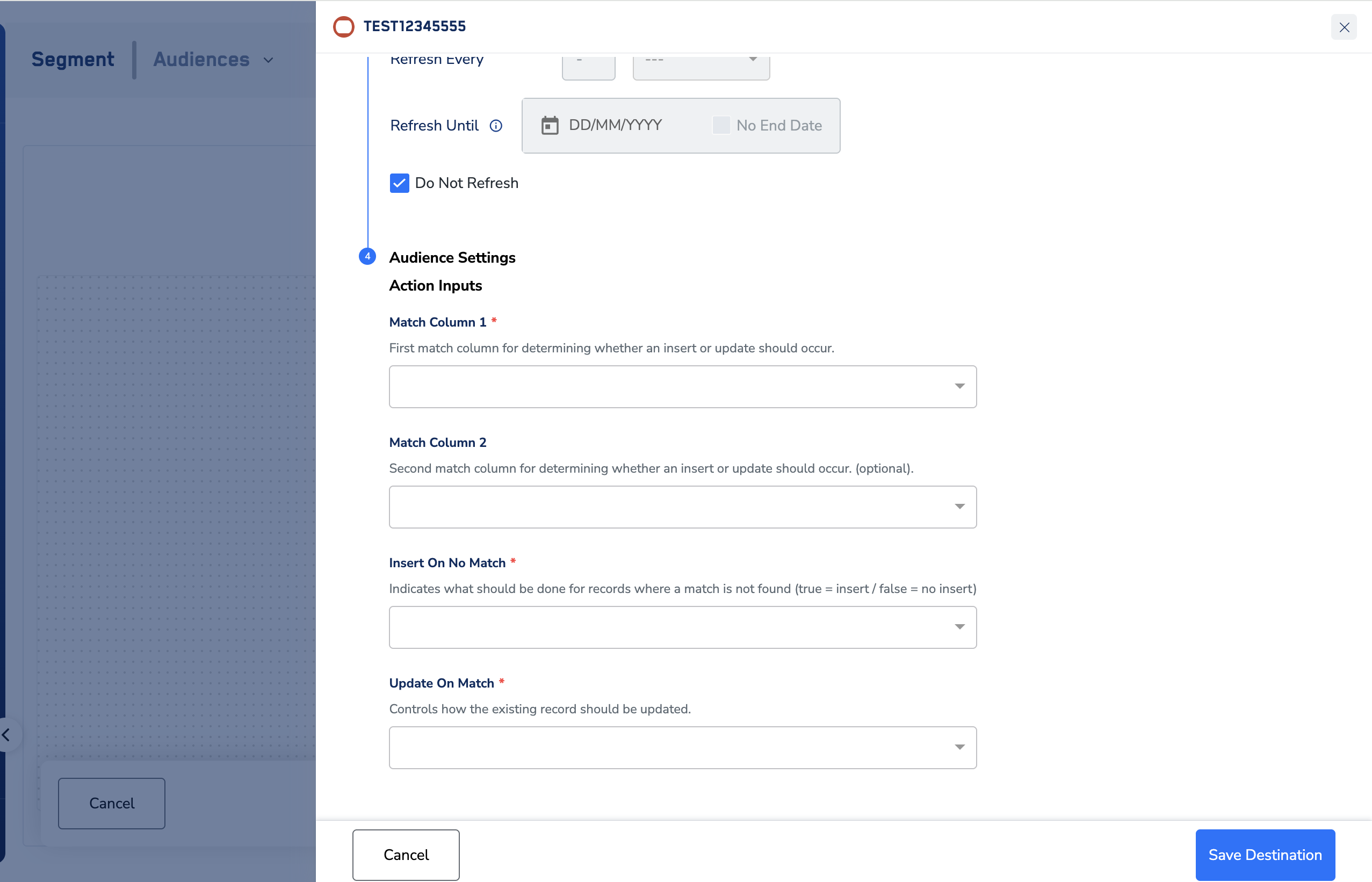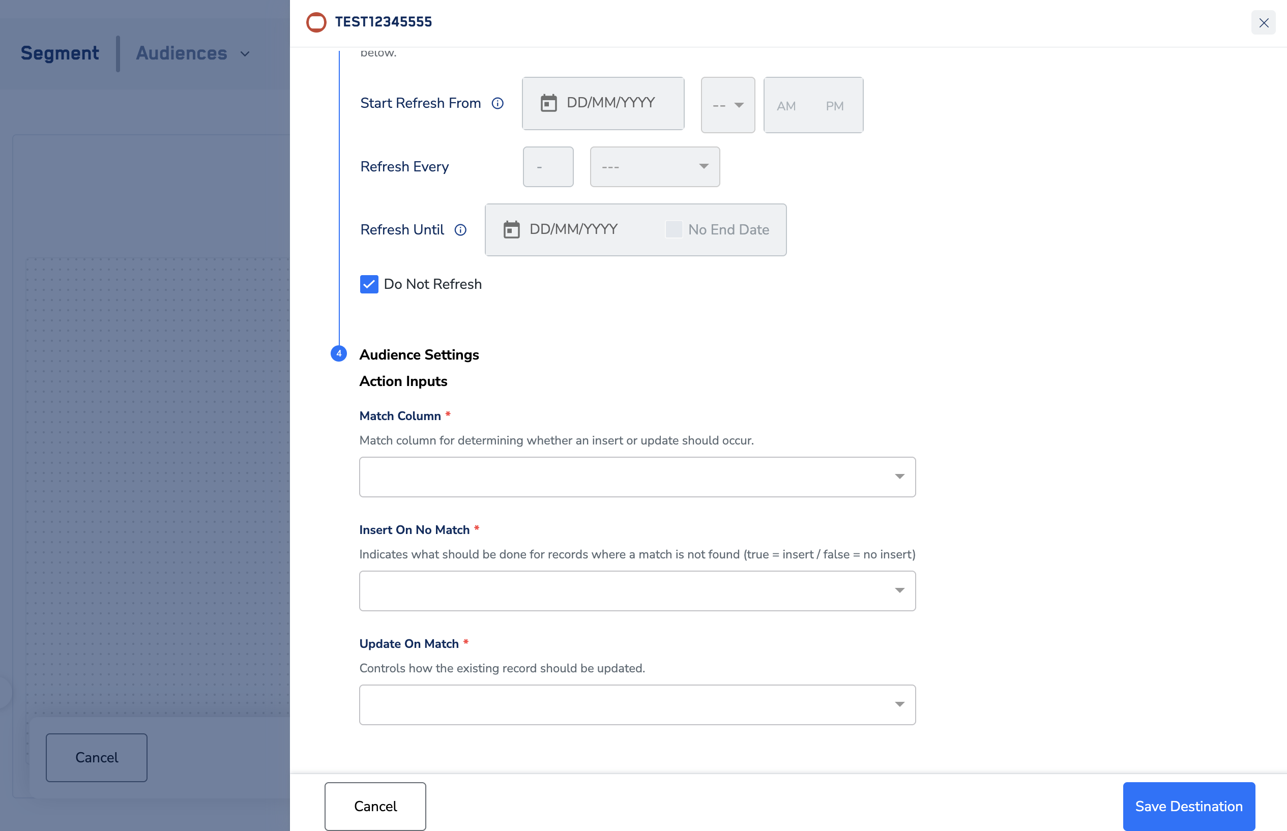 For information about how to link an Audience or segment to the created Destination in Audiences application, refer here.Note:The terms Audiences and Segments are used interchangeably to refer to customer cohorts belonging to a specific category. For example, an Audience or a segment could be a specific group of customers who are over 18 years of age and who have performed an