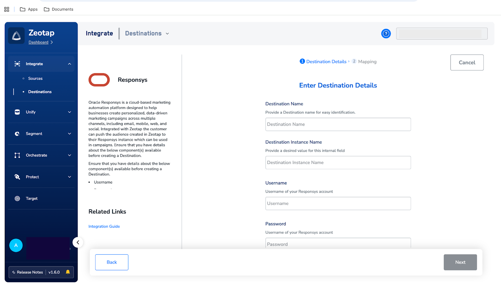 Before you create an Responsys Destination in Zeotap , ensure to have the following details :- Username a. This is the username of your Responsys account