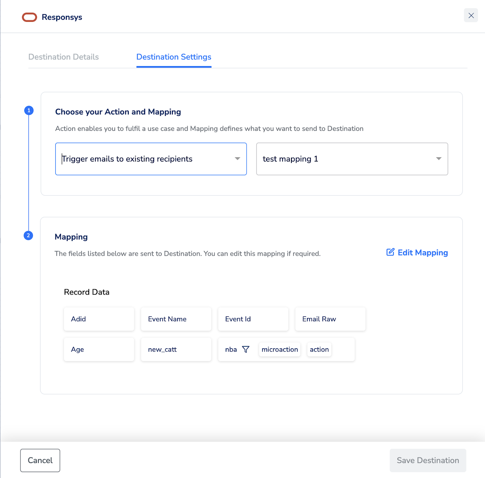 After creating a destination, next, you need to link it in the Send to Destination node within the workflow, as explained below.Under the Destination Details tab, all the fields required for Responsys destination that you entered while creating the destination is already populated. However, you need to enter the following details :a. Campaign namei. This is the Campaign name in Responsys which needs to be triggered based on the workflow setup in Zeotap.b. Match Column 1i. First match column for determining whether an insert or update should occur in Responsys.c. Match Column 2i. Second match column for determining whether an insert or update should occur in Responsys. (optional)d. Insert On No Matchi. Indicates what should be done for records where a match is not found in Responsys (true = insert / false = no insert)e. Update On Matchi. Controls how the existing record should be updated in Responsys (Values - Replace All, No Update)