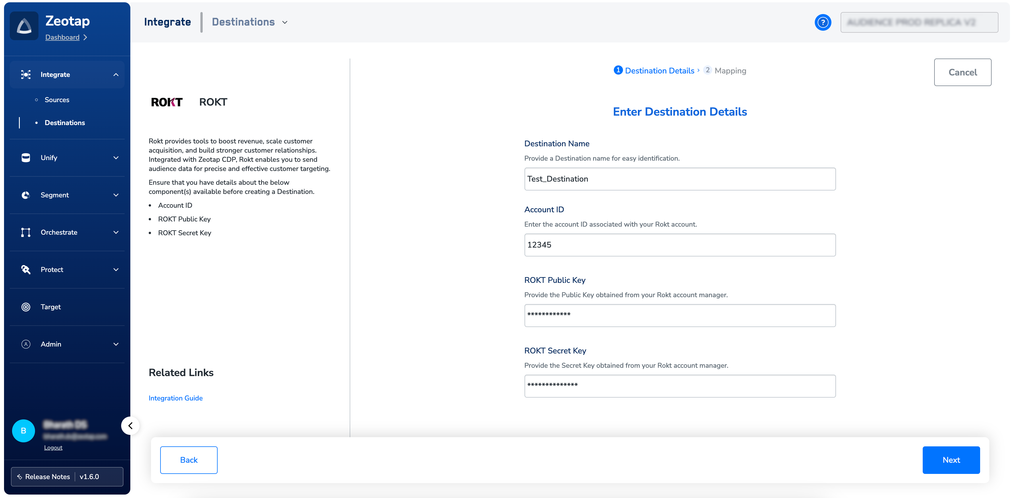 These keys authenticate the endpoint for sending data from Zeotap to Rokt. Reach out to your Rokt account manager to create a public and secret key pair for the account where you plan to send data from Zeotap CDP.Create a Destination for Rokt