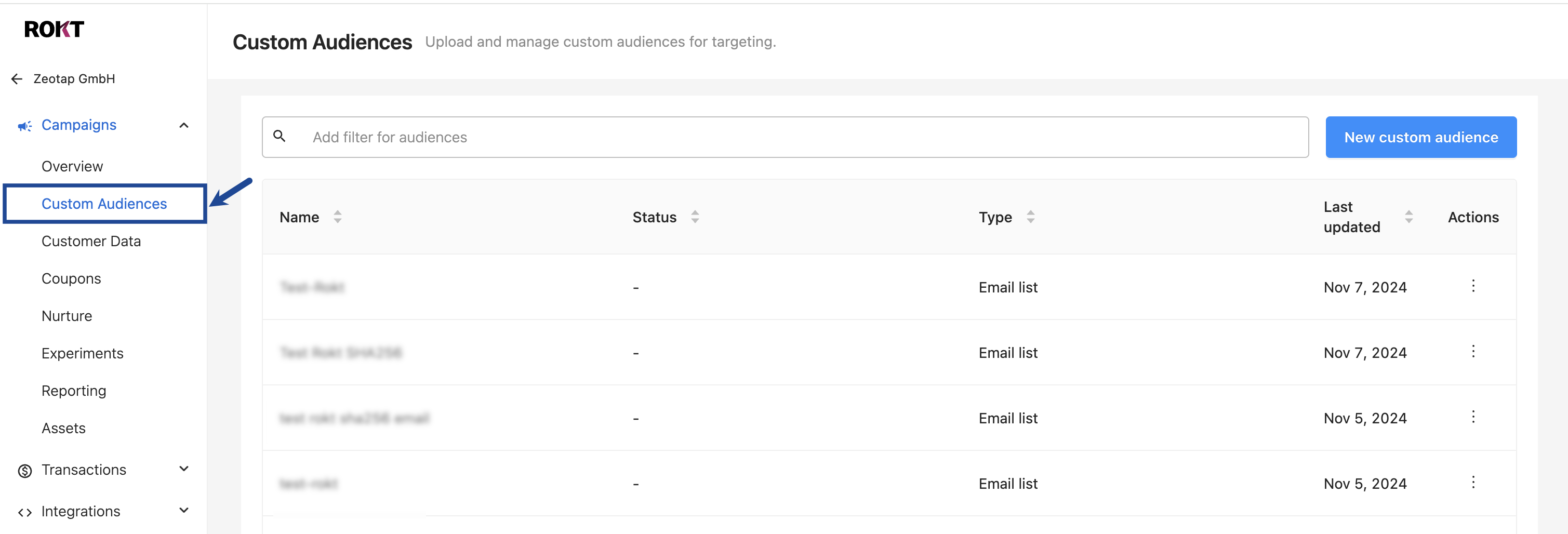 To view the audiences sent from Zeotap CDP to Rokt, perform the following steps:Note:It can take up to four hours (~4) for custom audiences pushed from Zeotap CDP to propagate through Rokt’s system and be visible on the front end.
