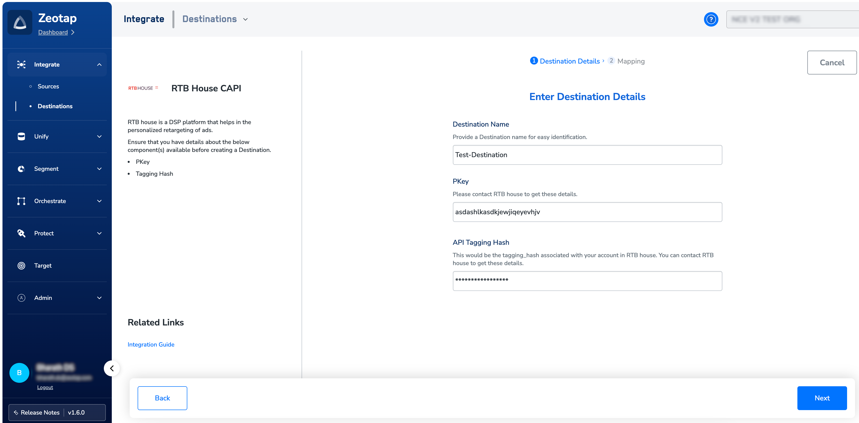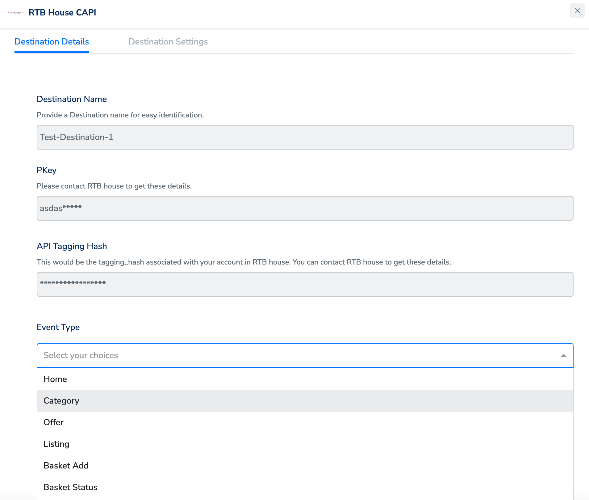 Perform the following steps to add a new destination:Enter the PKey and Tagging Hash obtained from the RTB house representative. These two fields serve as credentials for authorising you on the RTB House platform.