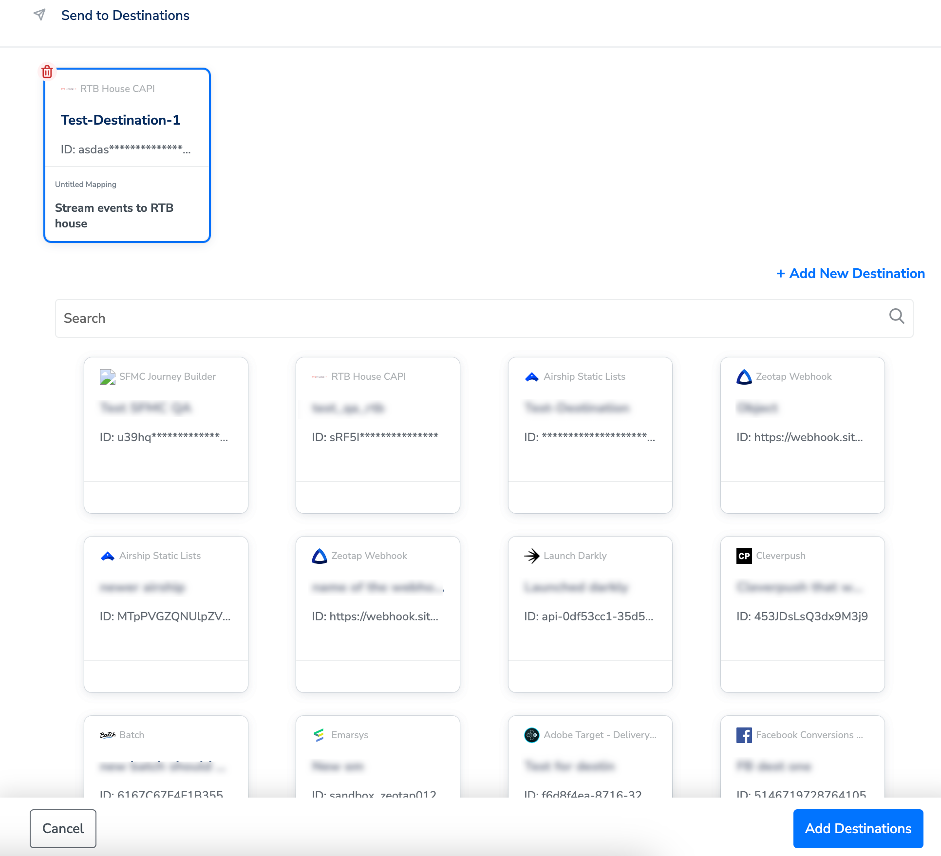 After you have applied filters or added conditions for your users in Journeys, you can activate them in RTB House CAPI under Send to Destinations. A new window appears, where you can set up your destination. You can use an already existing destination from the list of available Destinations **** or create a new one by clicking + Add New Destination.