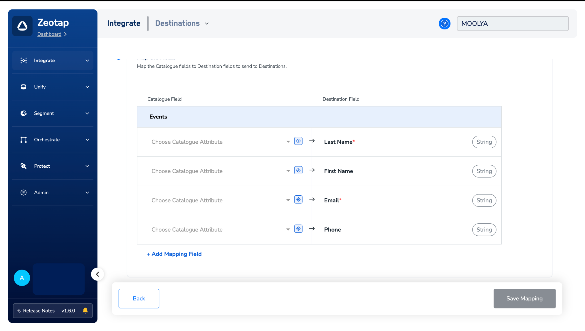 In the new screen that appears, choose the appropriate Action and mapping as explained below.a. Choose the desired action under Choose your Action and then choose the corresponding identifiers under Map the Fields. By default, the Output Identifiers that are accepted by the platform, such as Last Name, First Name, Email and Phone are displayed. However, you can edit, add, or remove an identifier from the list.