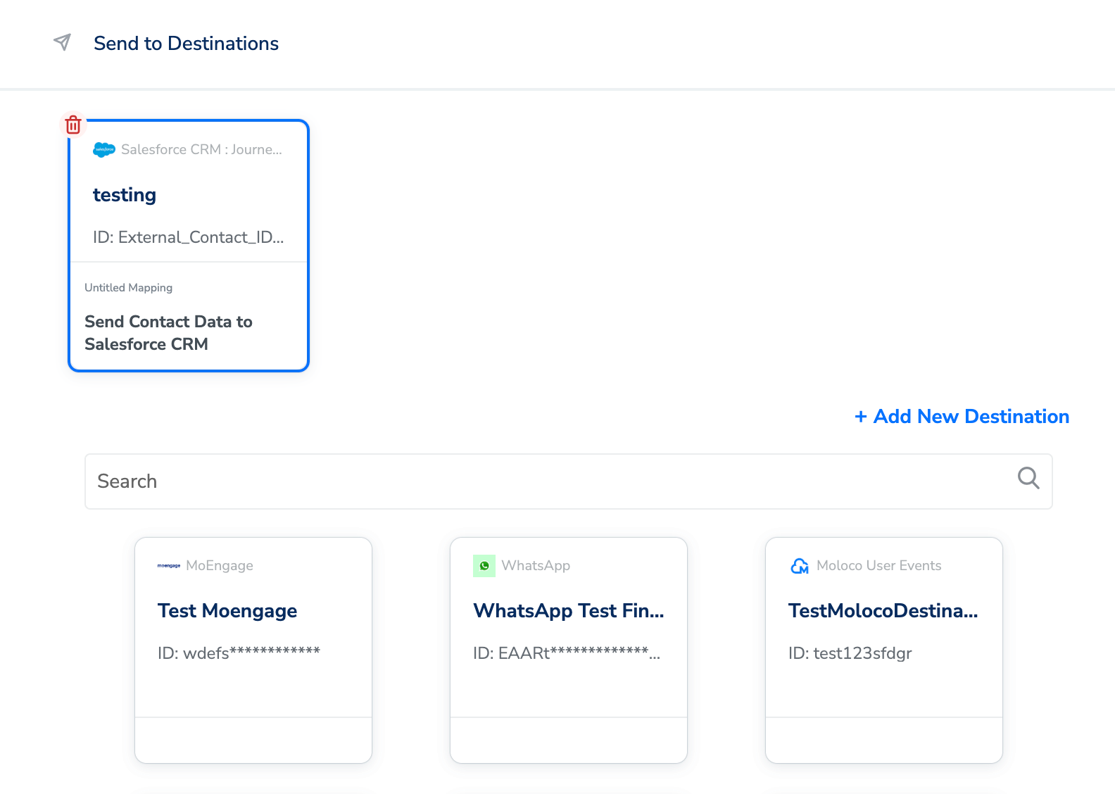 After creating a destination, next, you need to link it in the Send to Destination node within the workflow, as explained below.Under the Destination Details tab, the Domain Name, External Contact Object ID, Unique ID, App Client ID, App Client Secret fields are automatically populated based on the value that you have entered while creating the destination.