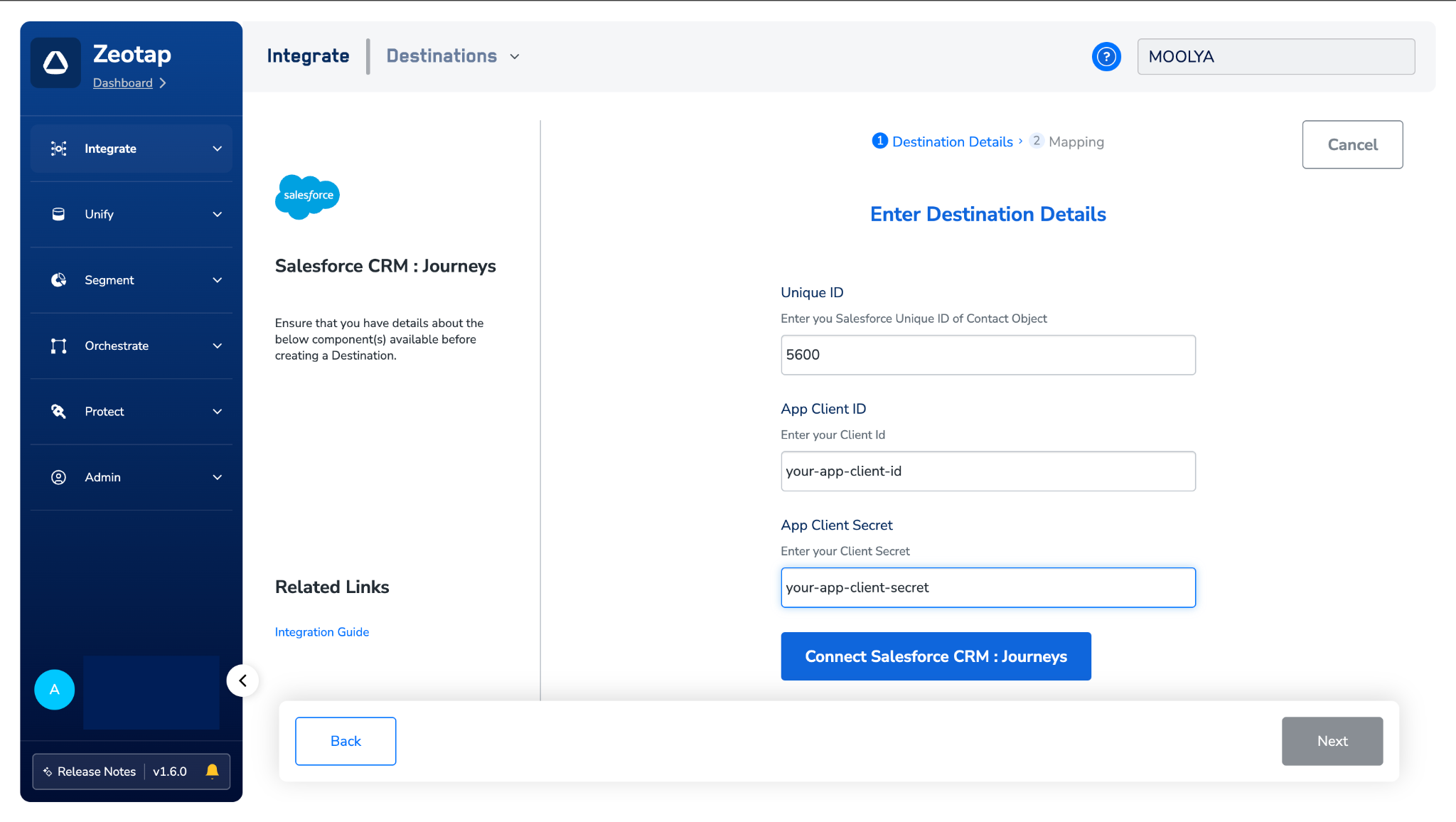 Click on Salesforce CRM : Journeys. A screen appears displaying details about the particular destination towards the left. On the right-hand side of the screen find a list of fields that are required for the integration to be established. Enter the required details as mentioned in the following steps:a. Enter a name for the Destination.