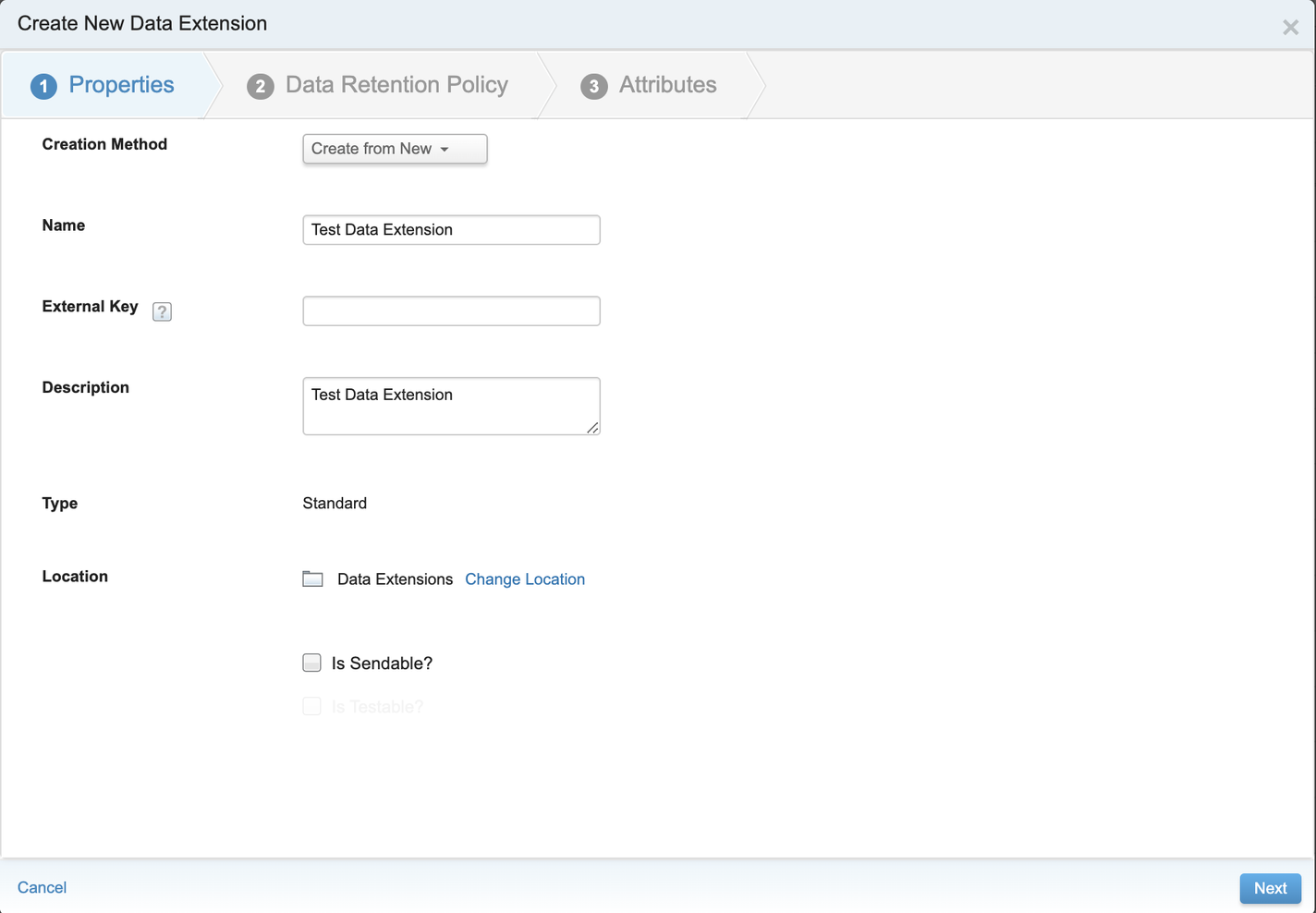 - Data Extension External Key- This is the key that is generated when you create a Data Extension, as shown in the image below.