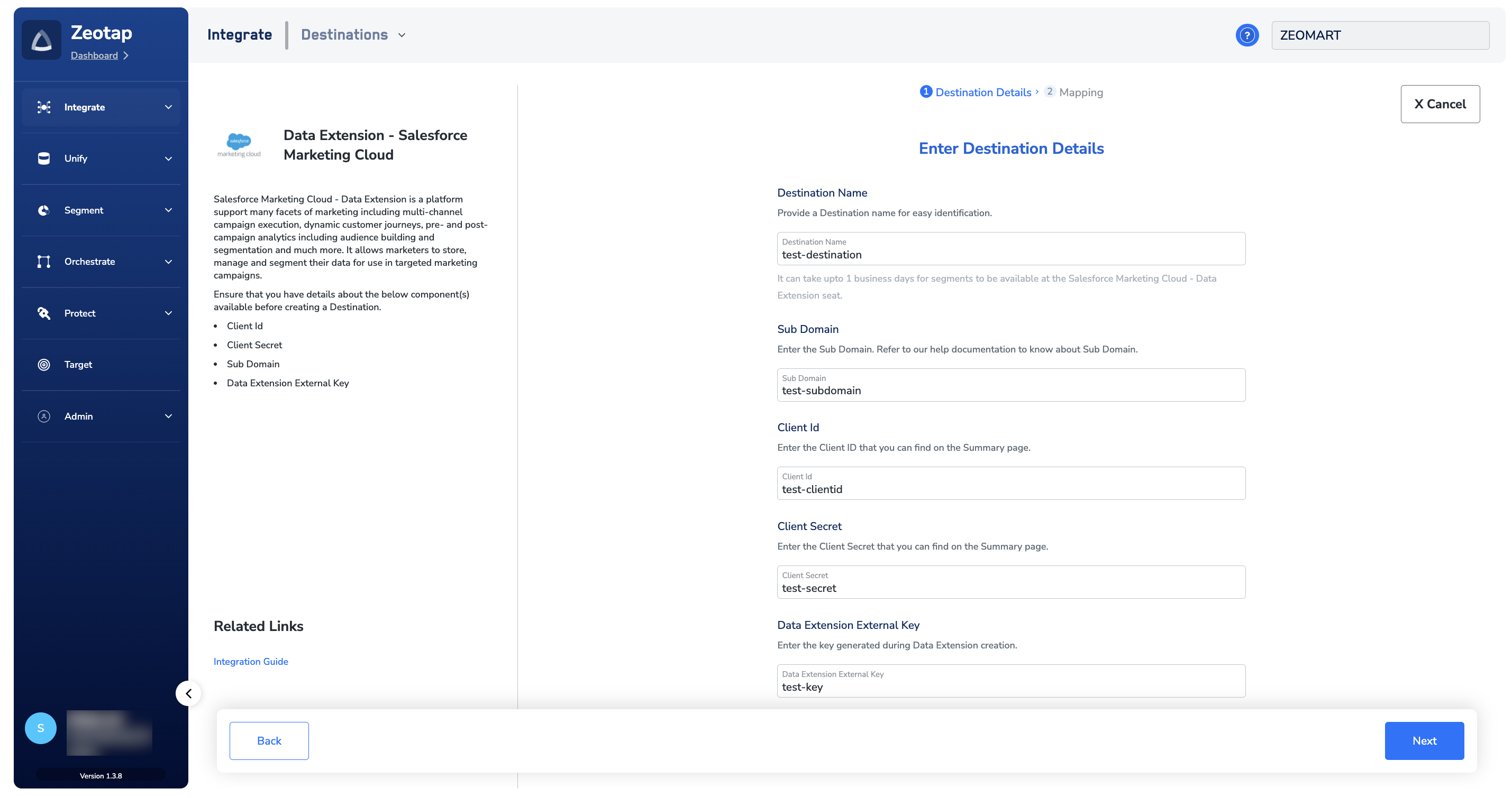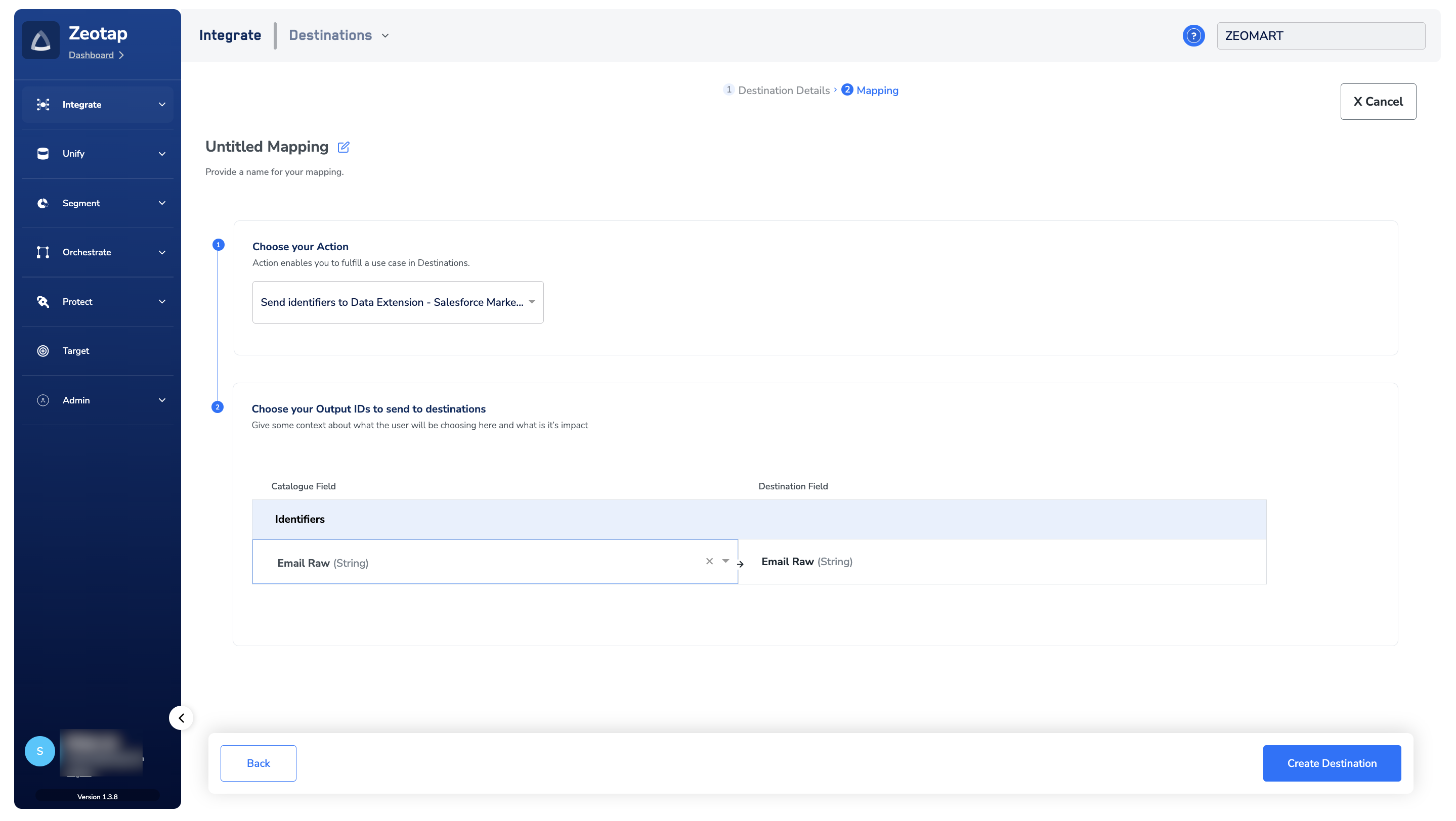 Salesforce Marketing Cloud - Data Extension is a platform support many facets of marketing including multi-channel campaign execution, dynamic customer journeys, pre- and post-campaign analytics including audience building and segmentation and much more. Integrated with Zeotap, it allows marketers to store, manage and segment their data for use in targeted marketing campaigns.Supported Identifiers/Attributes