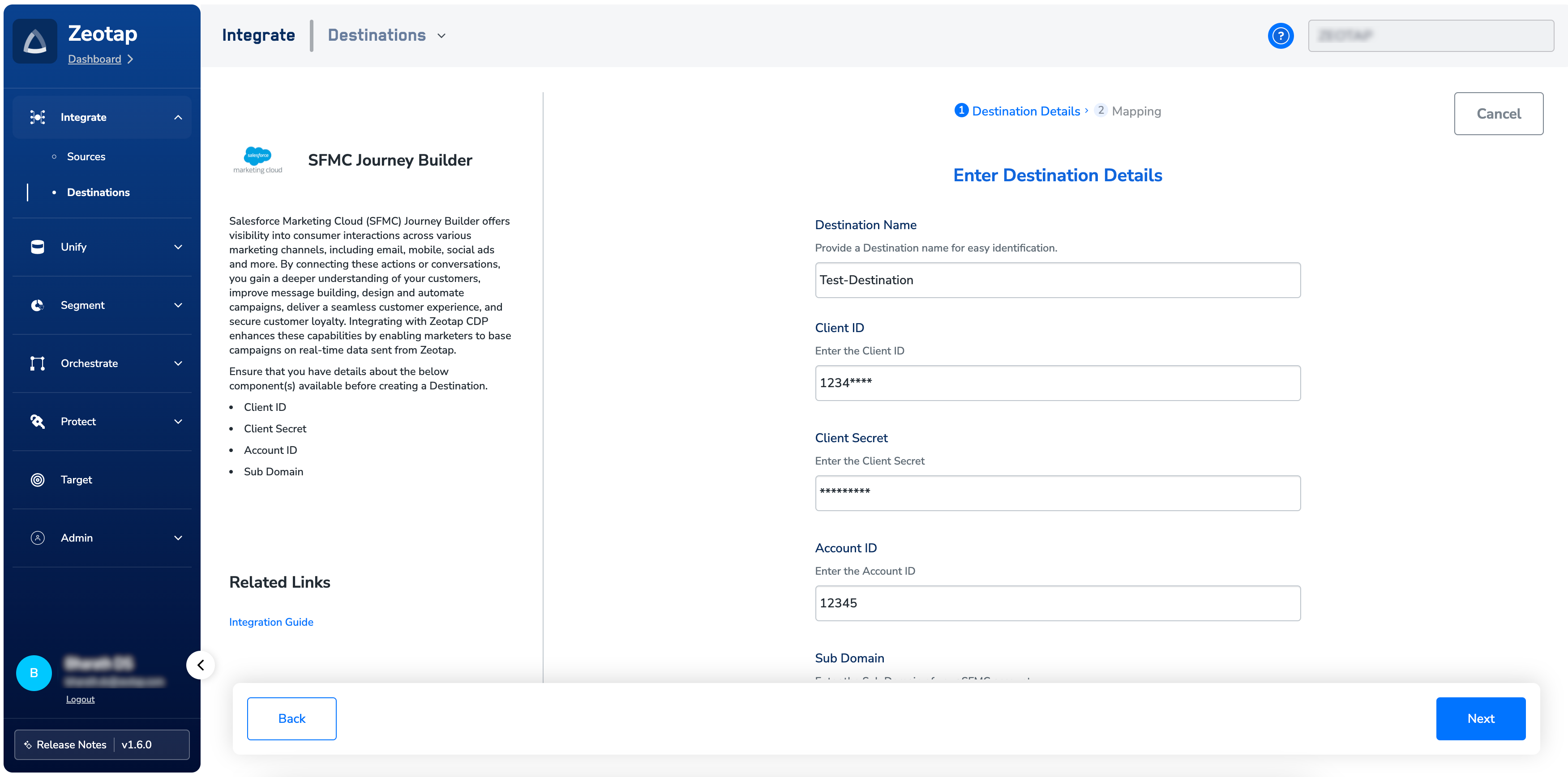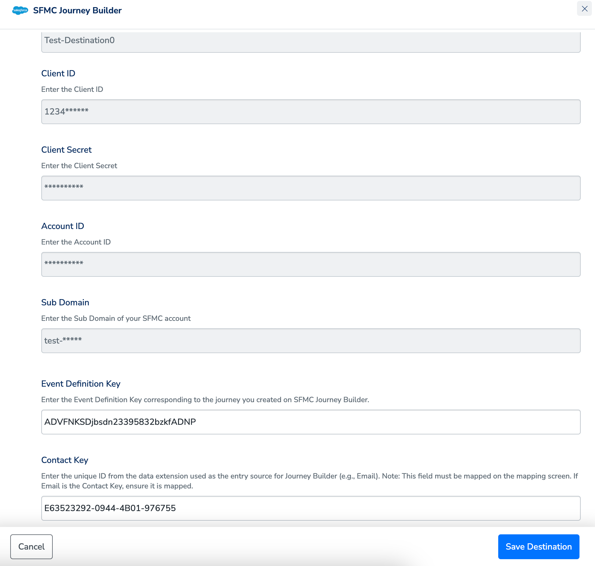 Perform the following steps to add a new destination:Enter the Client ID, Client Secret, Sub Domain details obtained from the Salesforce Marketing Cloud Summary Screen. Learn more