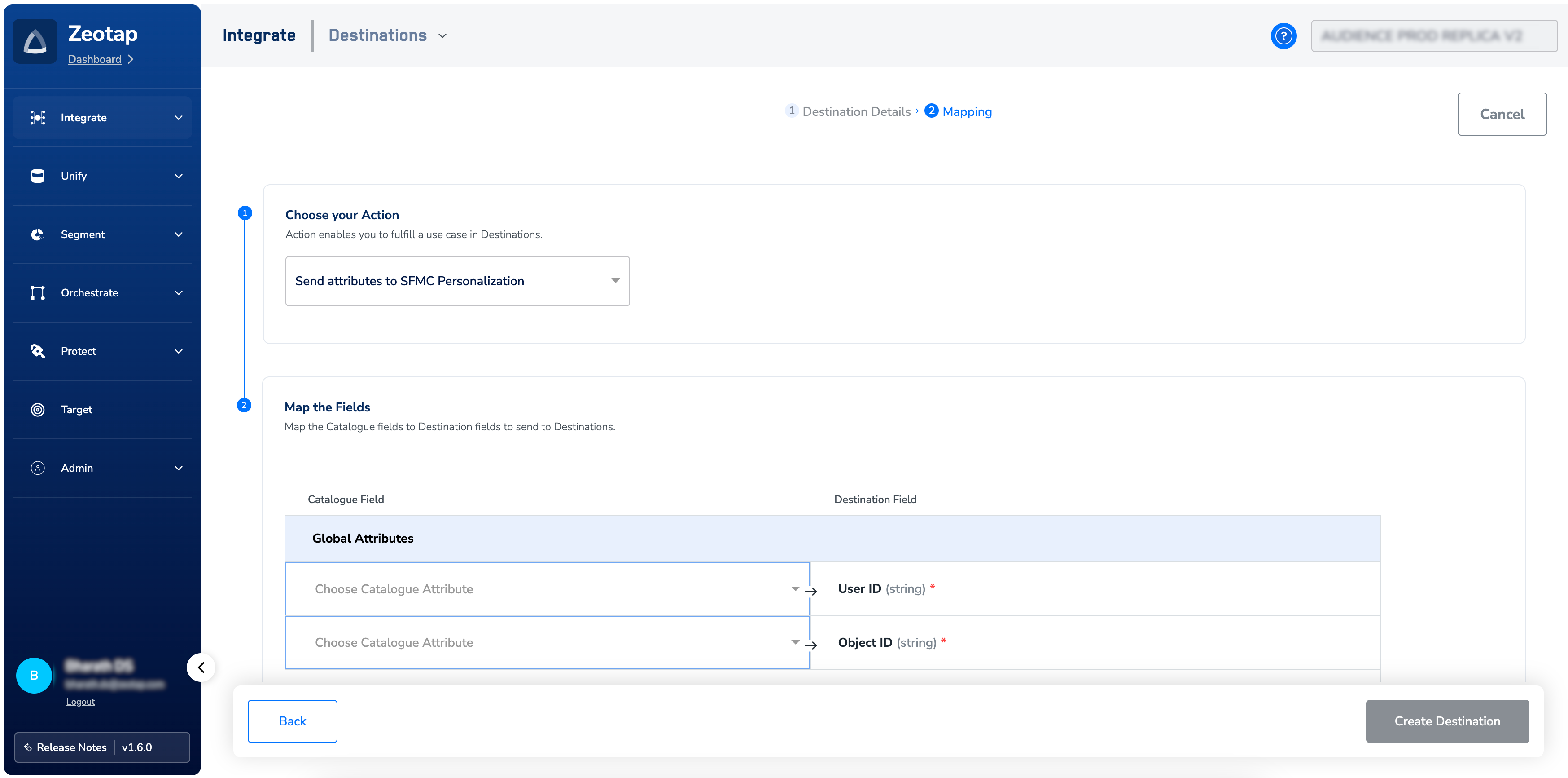 In the new screen that appears, under Choose your Action, choose Send attributes to SFMC Personalization as your action. Under Map the Fields, you can map the desired identifiers and attributes to send to your SFMC instance. Note that you must map the User ID and Object ID. Otherwise, you cannot proceed.