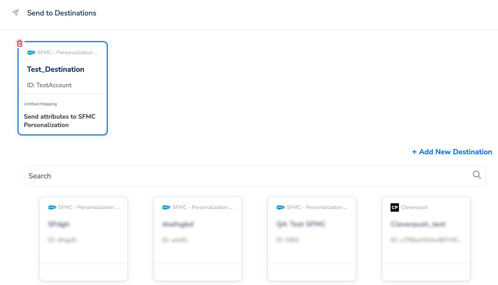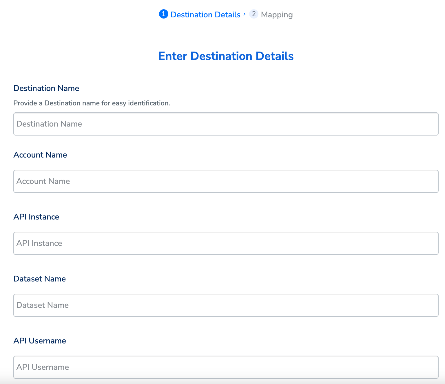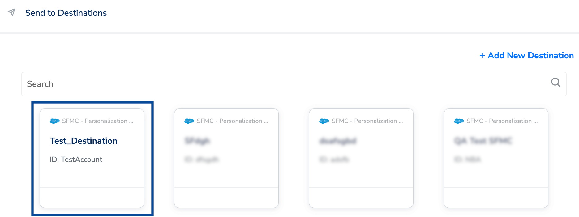 Perform the following steps to add a new destination:Enter the Account Name, API Instance and Dataset Name obtained your SFMC instance. Learn more