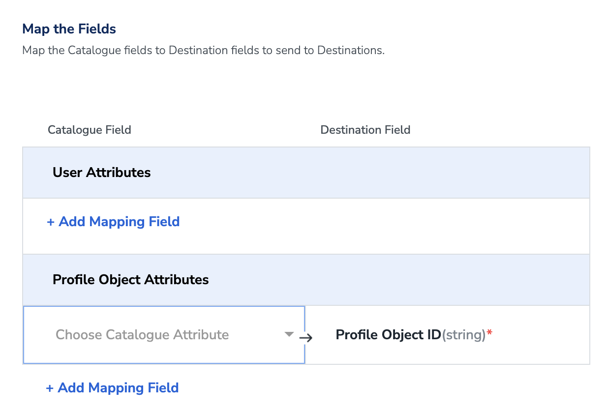 This integration allows you to send any identifiers and attributes of your choice. Ensure to map an identifier under User Attribute and mandatorily map the Profile Object ID.Note:For more information about the limits and capabilities in Marketing Cloud Personalization, including user attribute limits per dataset, user profile object limits, and account profile attribute limits, refer here.