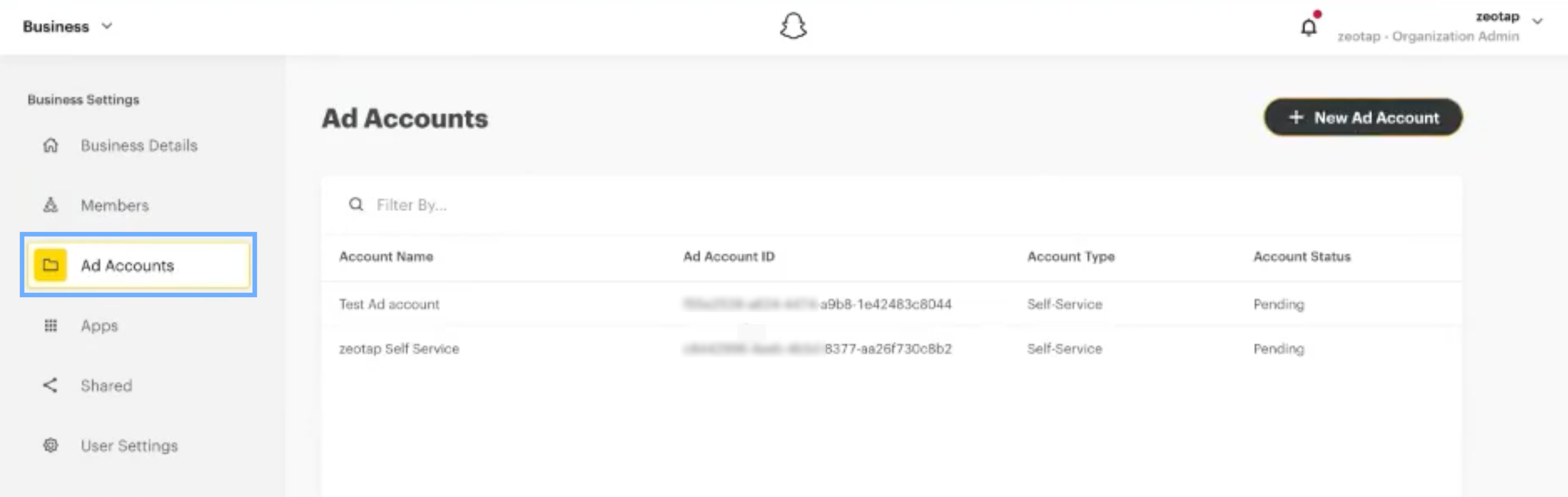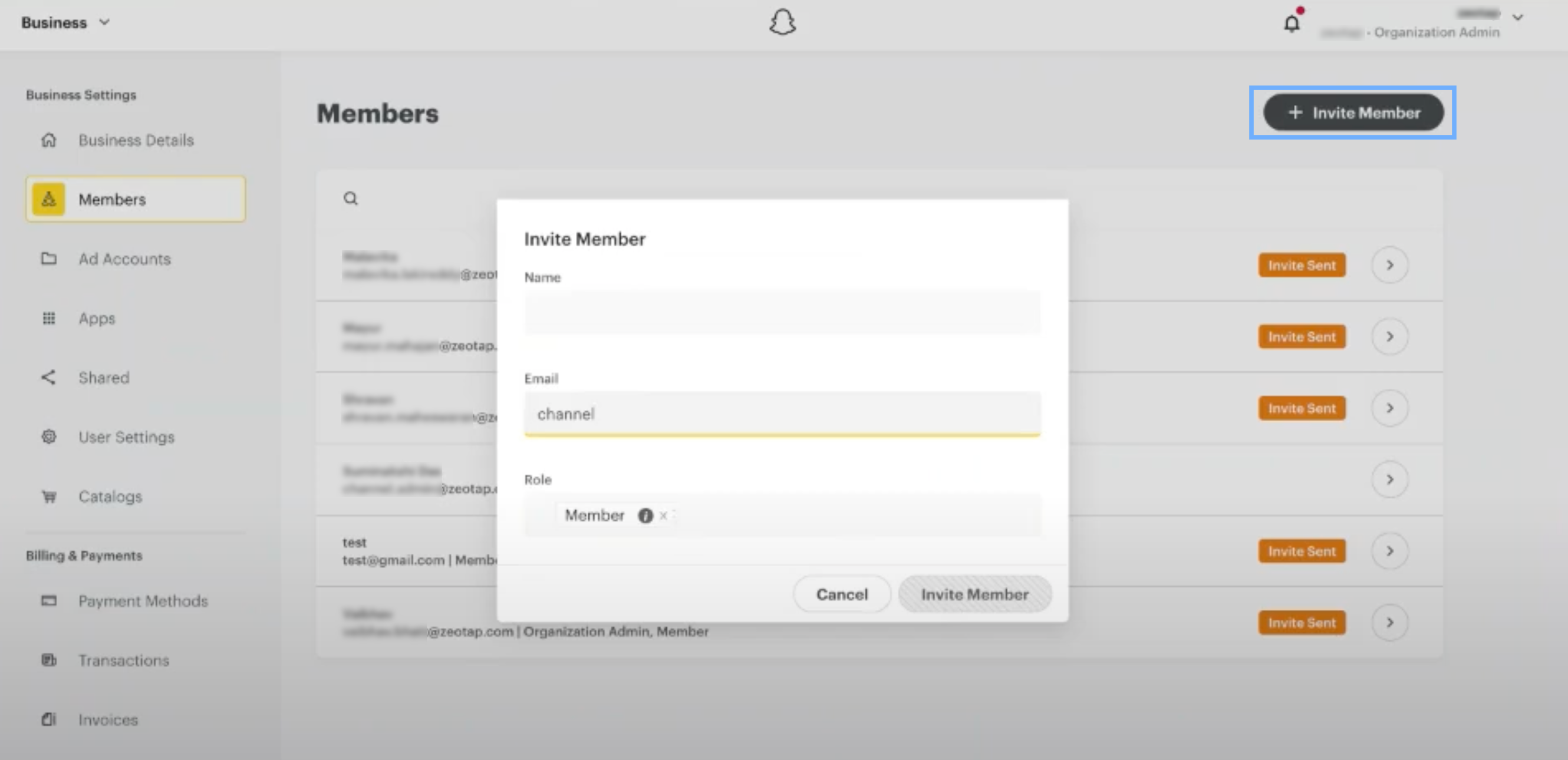 Before pushing segments for the first time to the Ad account ID, the client has to provide access to Zeotap for the specific Ad accounts where segments have to be pushed. To do so, first, the client has to send an invite to Zeotap to join their membership as below.Log into Snapchat Ads Manager as Admin.