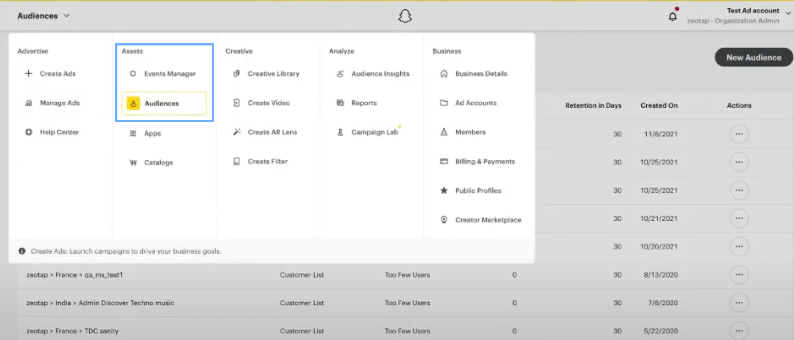 In the Snapchat Business Manager console, you can find the pushed segments under Assets → Audiences.