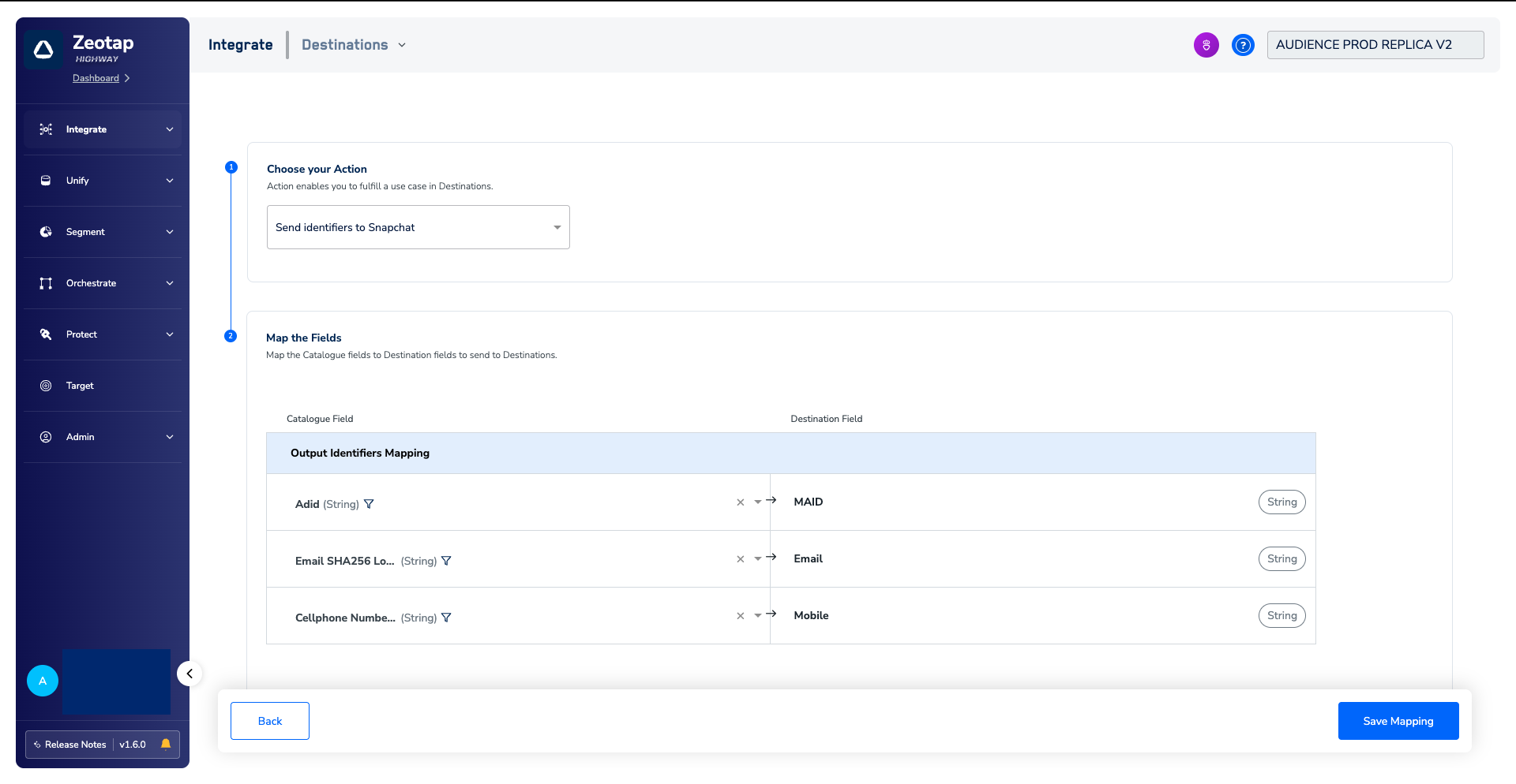In the new screen that appears, choose the appropriate Action and mapping as explained below.a. Choose the desired action under Choose your Action and then choose the corresponding identifiers under Map the Fields. By default, the Output Identifiers that are accepted by the platform such as, MAIDs, Cookies, Email are displayed. However, you can edit, add or remove an identifier from the list. To do so, refer here.b. Click Create Destination. The created Destination gets listed in the Target and Audiences applications, which can be linked to an Audience/segment.