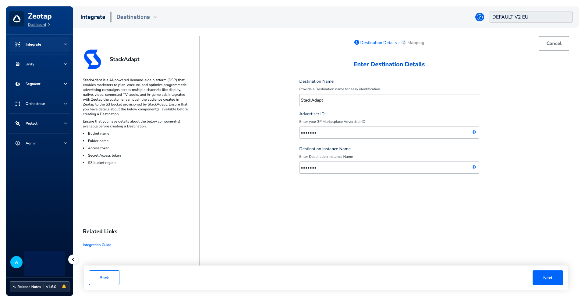 Once you have obtained the prerequisites mentioned in the above section, perform the following steps to create a Destination for StackAdapt:Click StackAdapt. A screen appears displaying details about the particular destination towards the left. On the right-hand side of the screen find a list of fields that are required for the integration to be established. Enter the required details as mentioned in the following steps:a. Enter a name for the Destination.b. Enter the 3P Marketplace Advertiser ID.