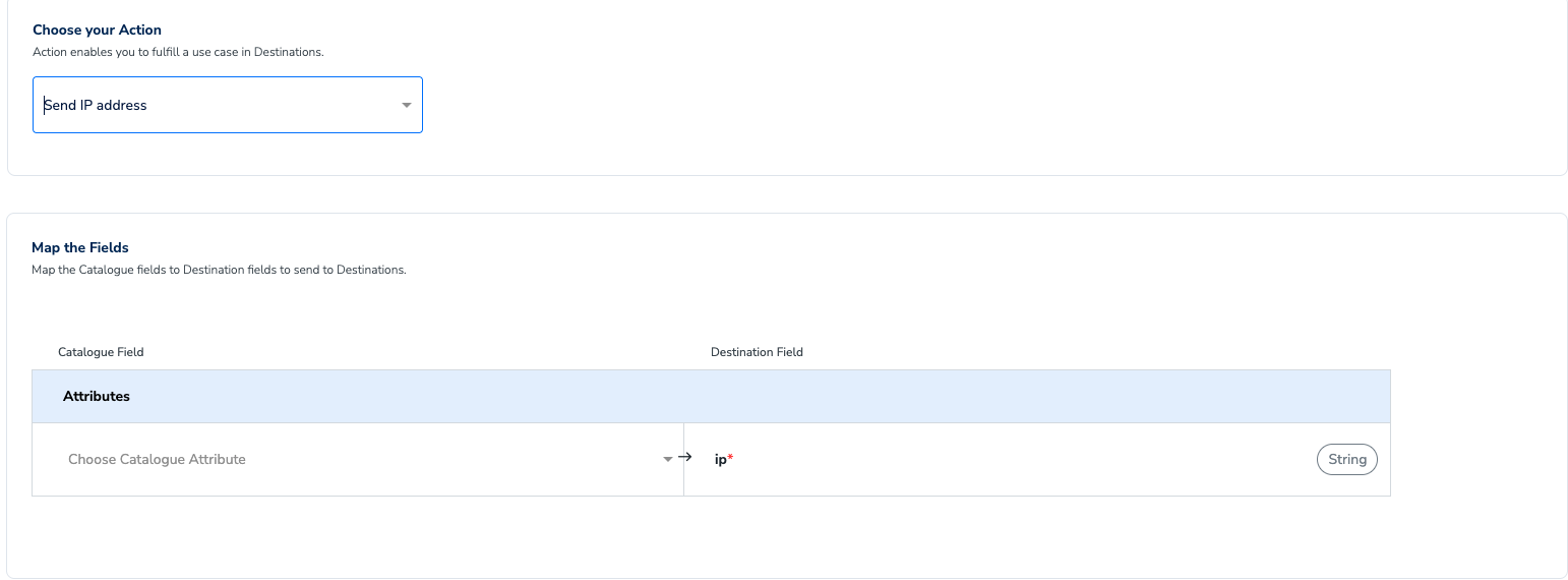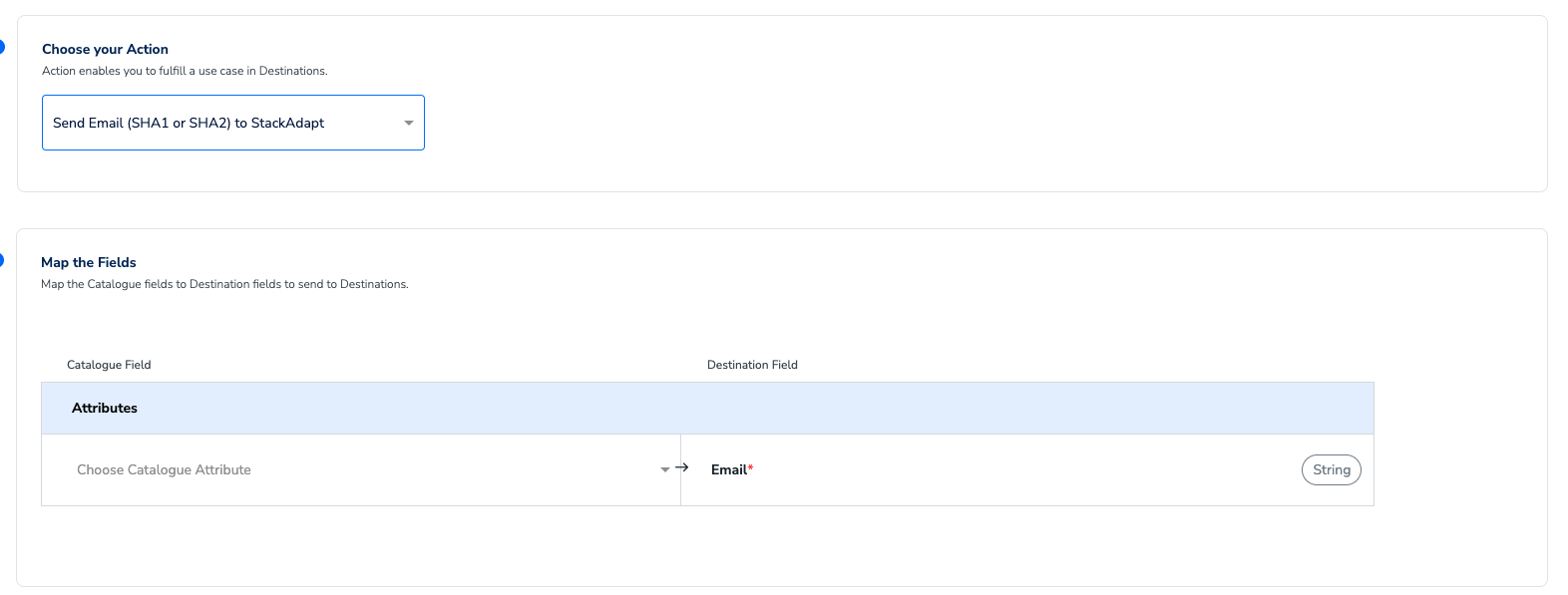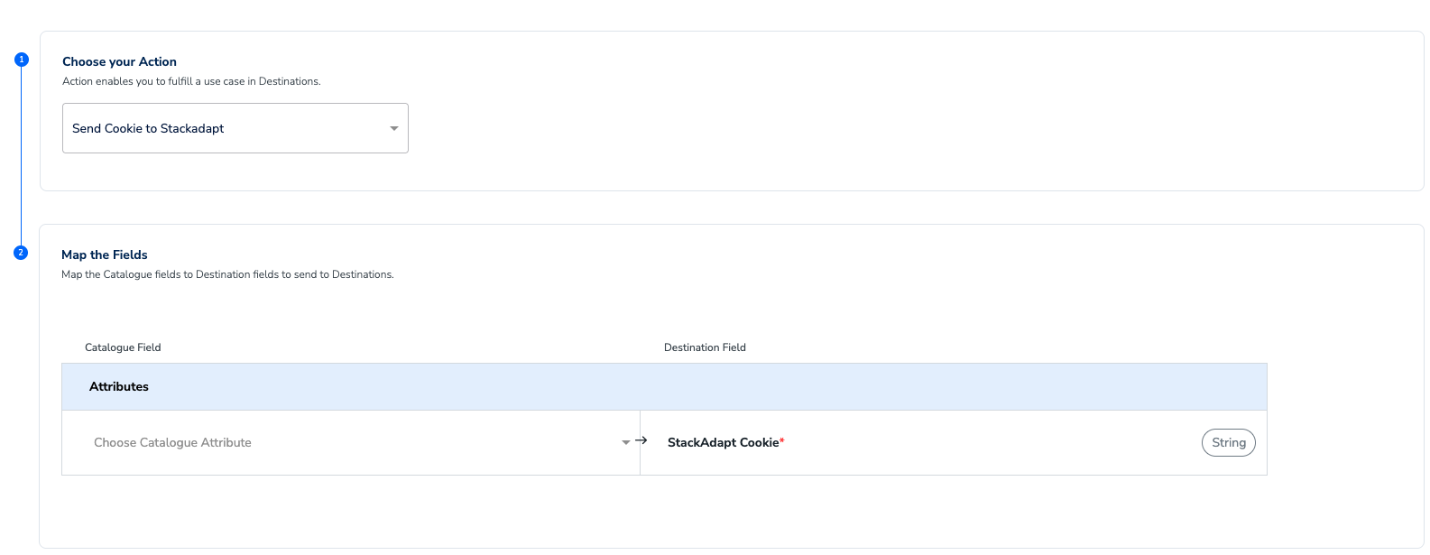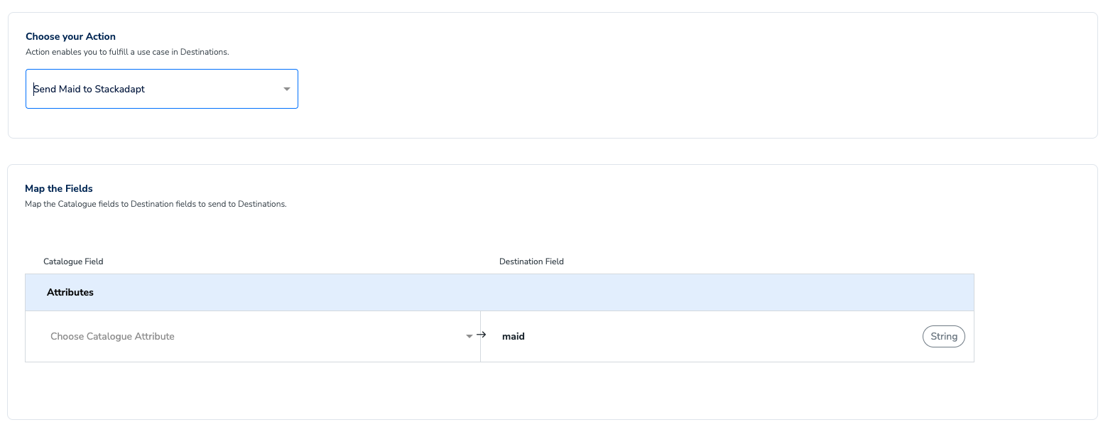 On the Action and Mapping screen, select from Send Cookie to StackAdapt, Send SHA1 or SHA2 Email to StackAdapt, Send MAIDs to StackAdapt, or Send IP Address to StackAdapt as the action, based on the identifiers you want to send. Then, map the Catalogue and Destination fields accordingly.a. If you choose Send Cookie to StackAdapt, then you can send only Cookies to StackAdapt.