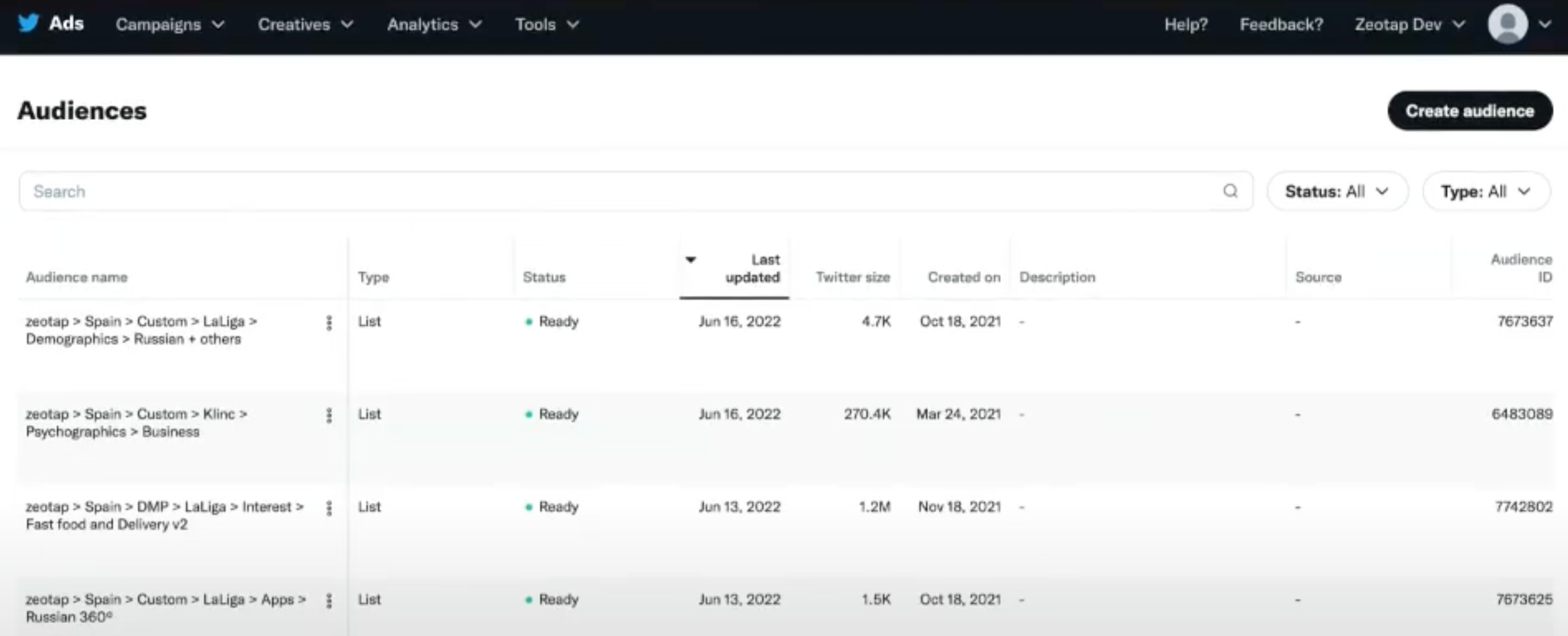 Once the segment is pushed, it will appear in Twitter Ads Manager under Tools → Audiences.