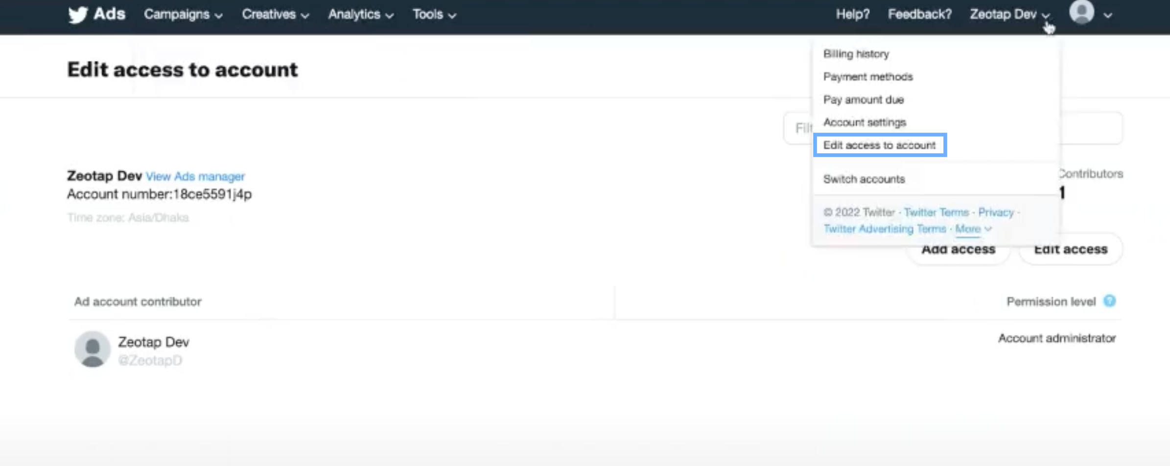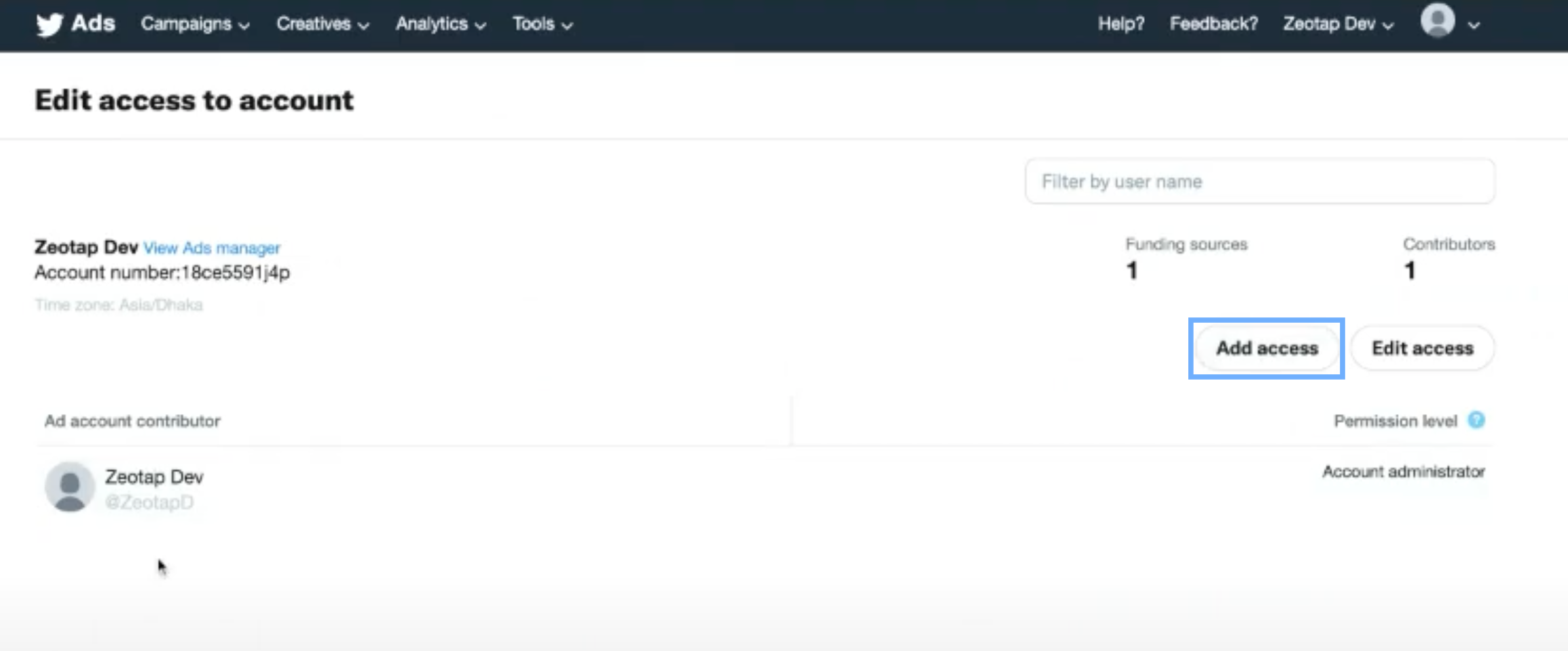 Note:The user must provide access to Zeotap in their Twitter Ad Account. This can be done by following the steps mentioned here.