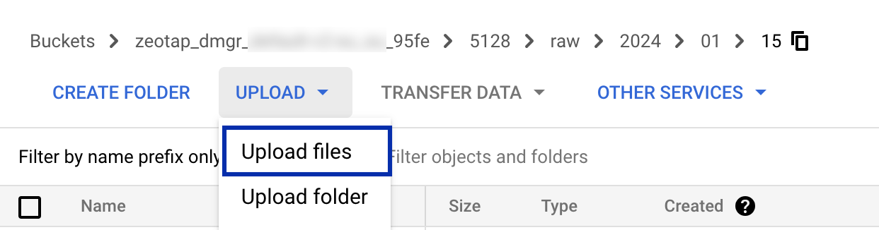 After the folder restructure is created in the OBJECTS tab, perform either of the following steps:a. Drag and drop the desired files from your desktop or file manager to the main pane in the Cloud Console.b. Click the Upload Files button, select the files you want to upload in the dialog that appears and then click Open.
