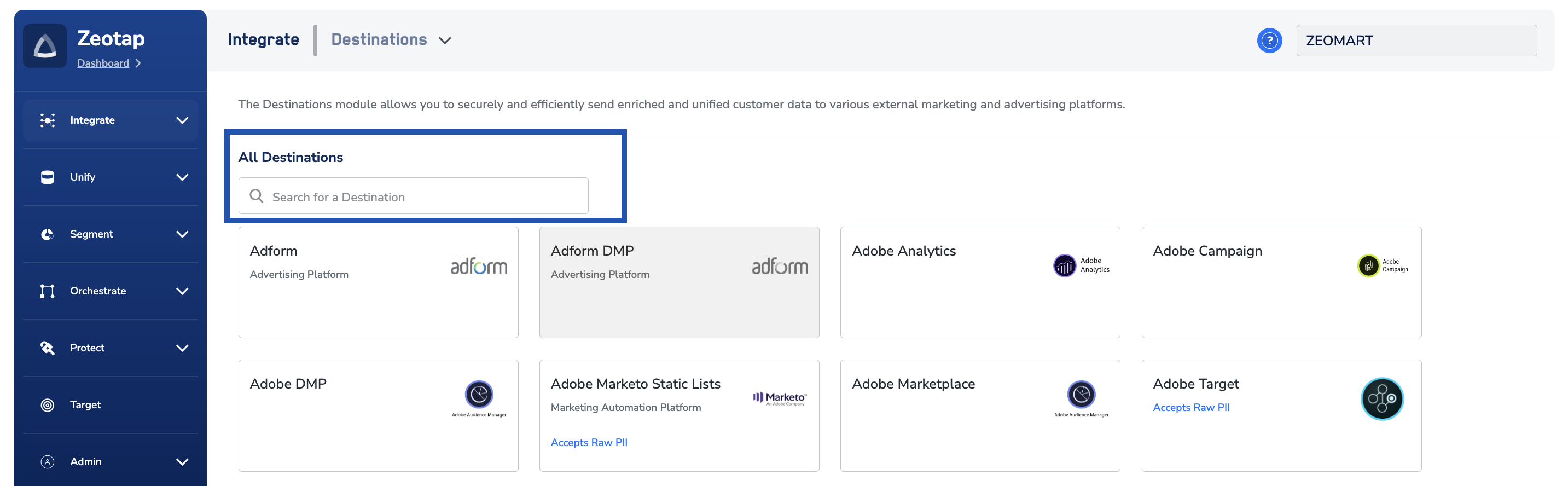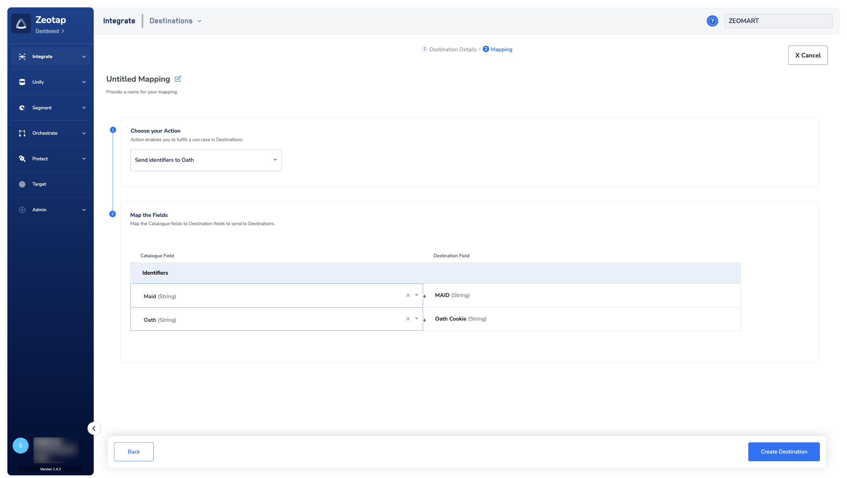 In the new screen that appears, choose the appropriate Action and mapping as explained below.a. Choose the desired action under Choose your Action and then choose the corresponding identifiers under Map the Fields. By default, the Output Identifiers that are accepted by the platform such as, MAIDs, Cookies, email Ids and more are displayed. However, you can edit, add or remove an identifier from the list. To do so, refer here.b. Click Create Destination. The created Destination gets listed in the Target and Audiences applications, which can be linked to an Audience/segment.