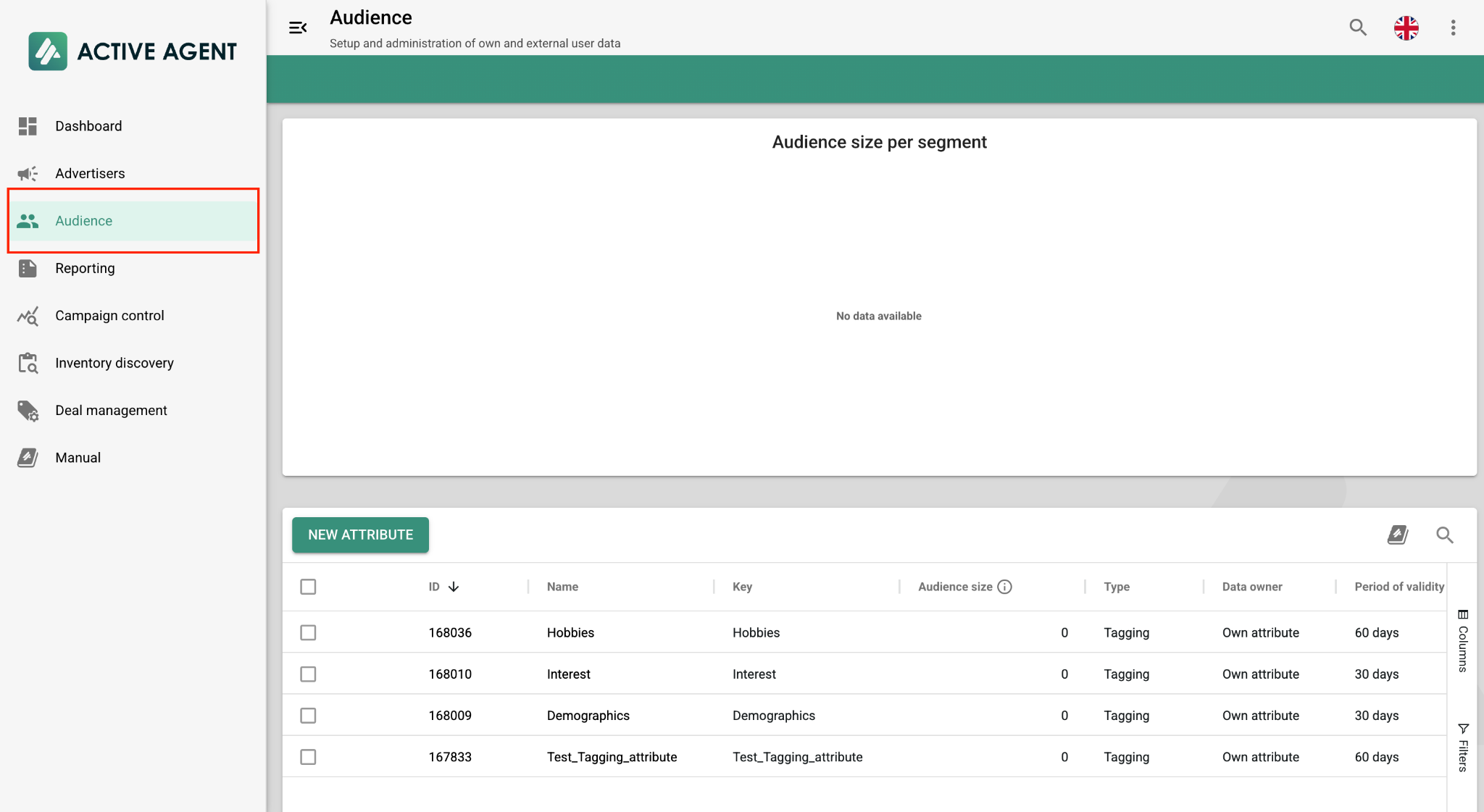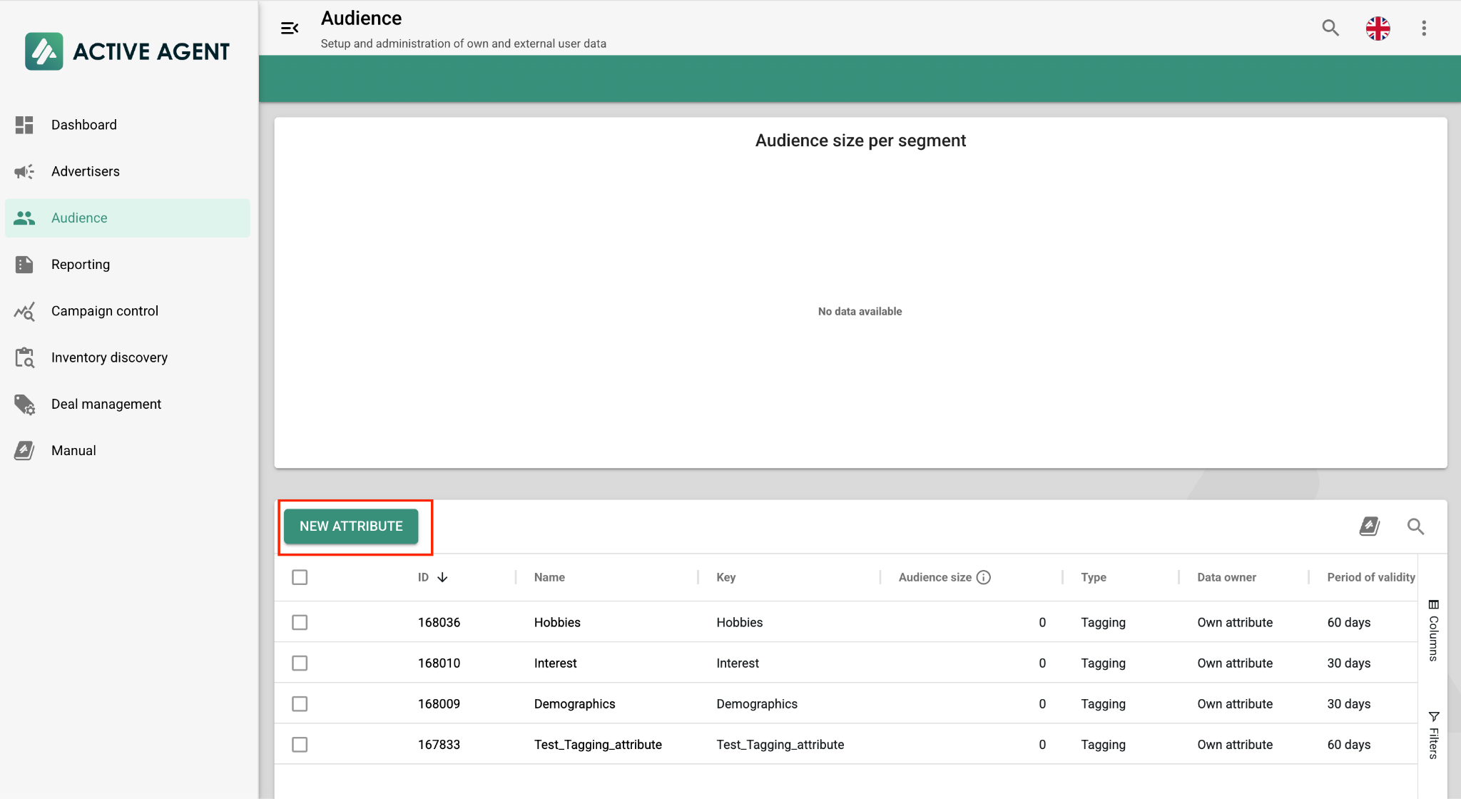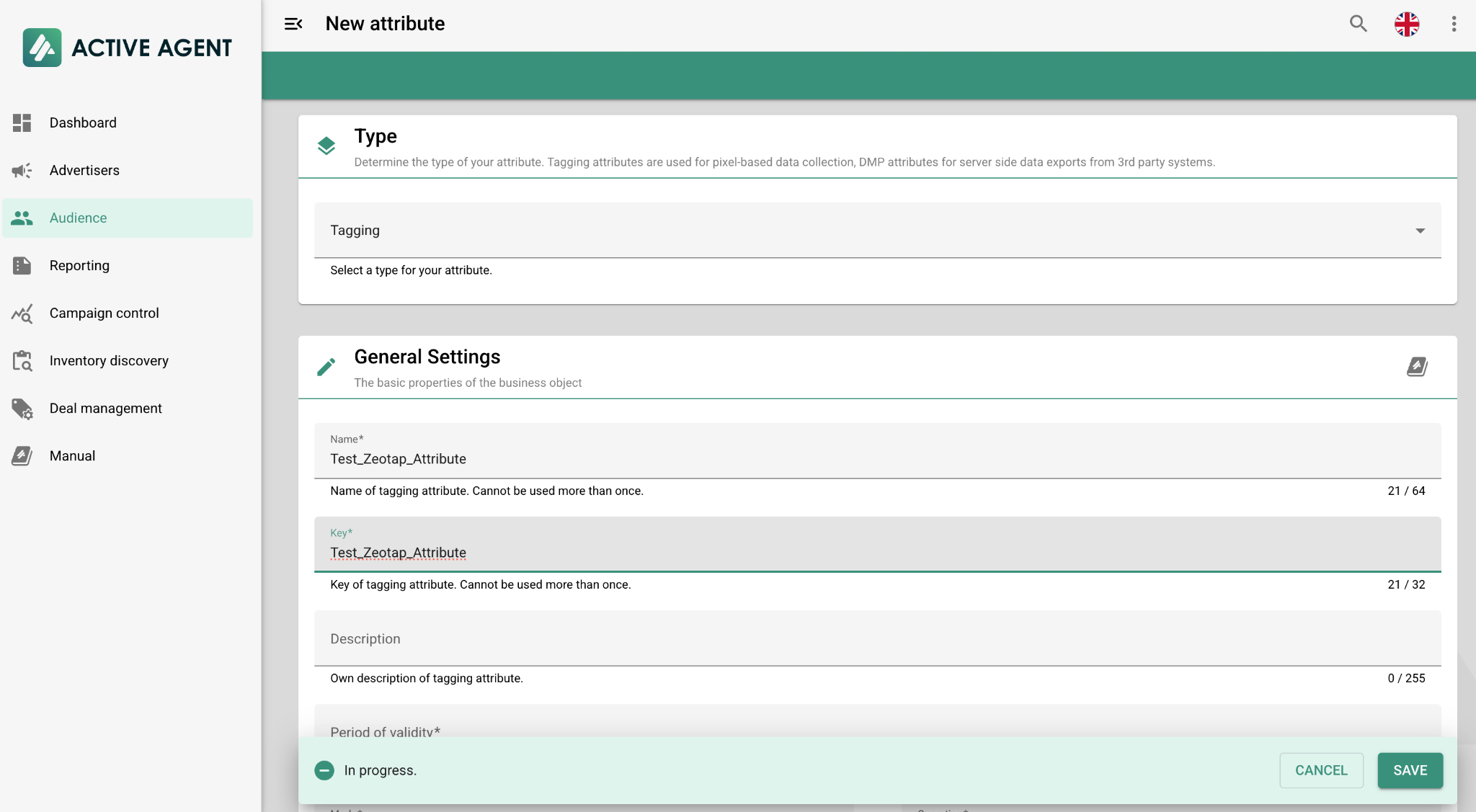 Configure the new attribute:a. Type: Select Tagging.b. Name & Key: Enter the desired name and key for the segment.c. Period of Validity: Specify the duration in days.d. Click Save.