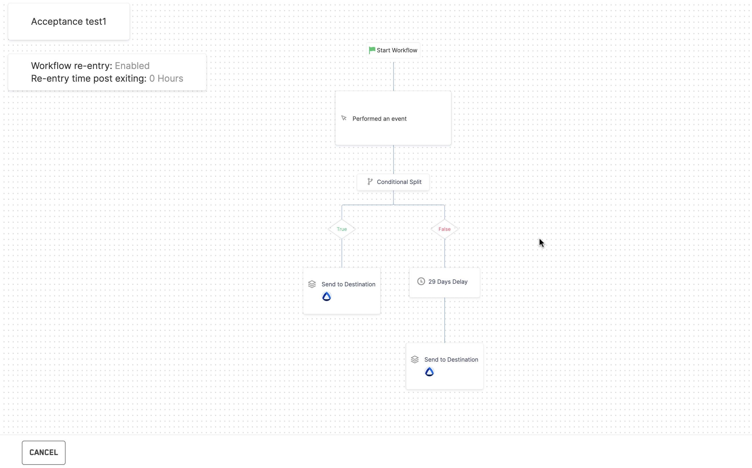 You divide your workflow into two mutually exclusive branches based on a condition. Users fulfilling the condition move to the True branch and others to the False branch. Unlike a Multi-branch split, where a user can be part of multiple branches, in a true-false split, a user can only qualify for the True branch or the False branch.