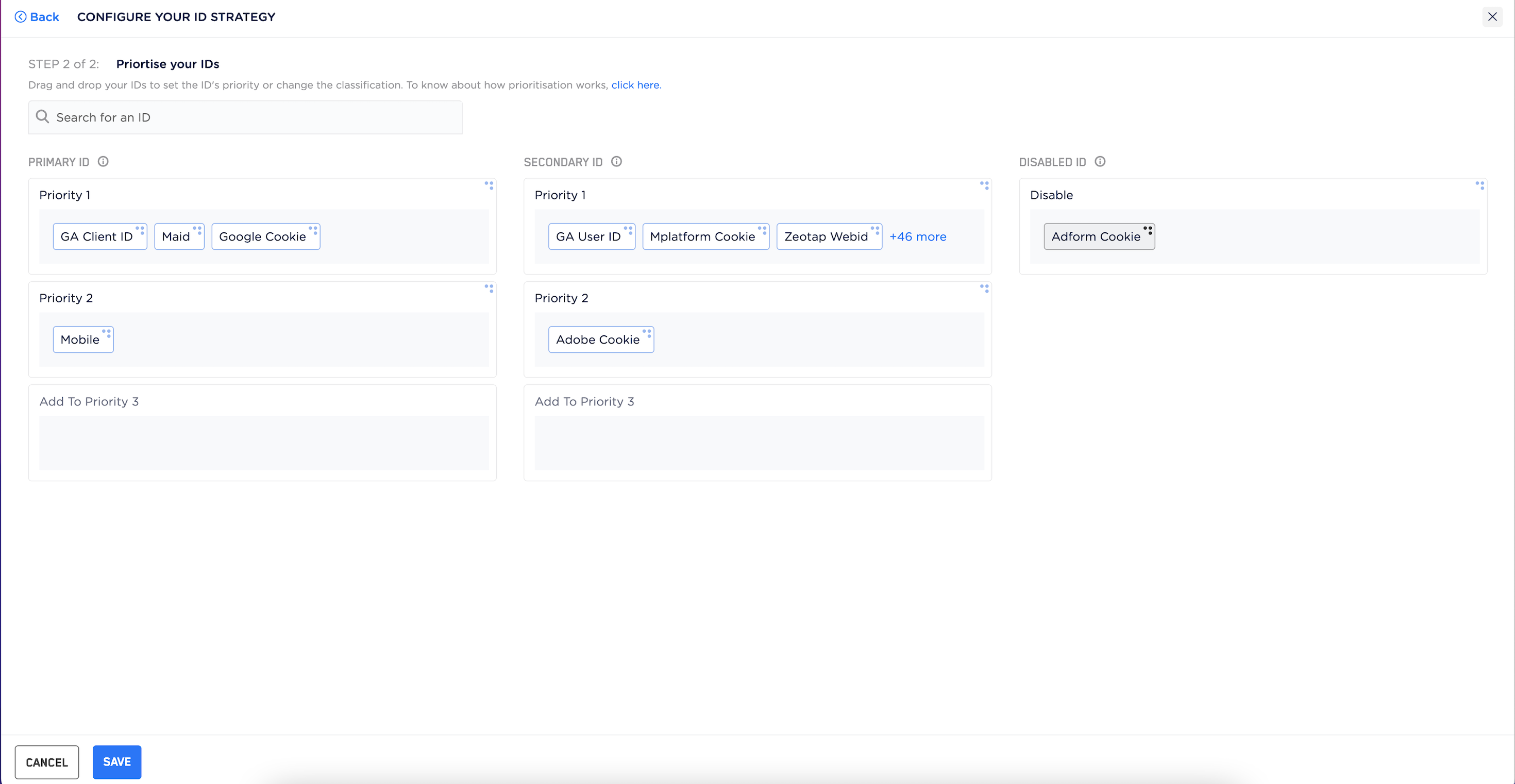 (Released on 13-07-2023) The ID Prioritisation feature allows you to group your IDs into different buckets such asPrimary ID, Secondary ID or Disabled ID. For example, designate accurate and persistent identifiers as Primary ID, while others can be classified as Secondary ID or Disabled ID. It also provides flexibility to customise the priority of your IDs within each bucket. For instance, assign higher priority to your internal customer identifiers like User ID over other identifiers like email or cellphone number.