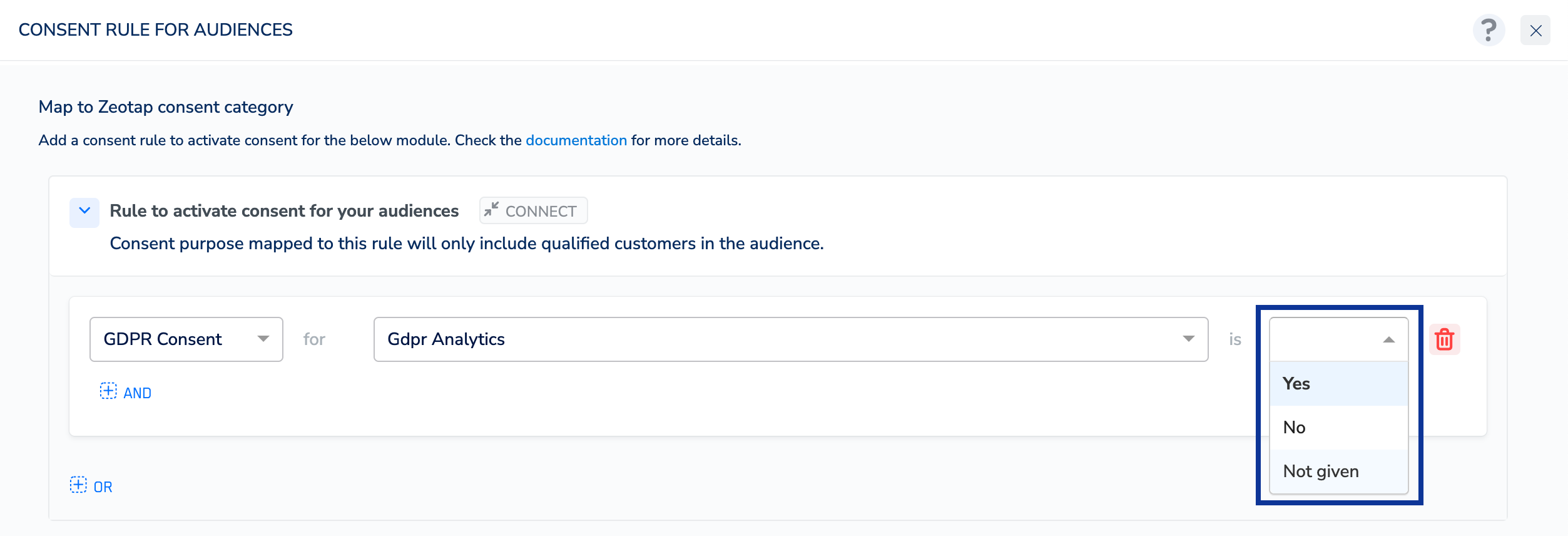 (18-01-2024) Previously, only Yes or No options were available for configuring the Consent or Marketing preference for a customer. When there was no explicit consent recorded for the customer, it resulted in null value being stored for their consent attribute in Zeotap. Null value, which is typically interpreted as a No can avoid the customer from being targeted. To prevent this, we have introduced Not Given as one of the conditions for the rule. In addition, you can define the action for Not Given as per your use case.