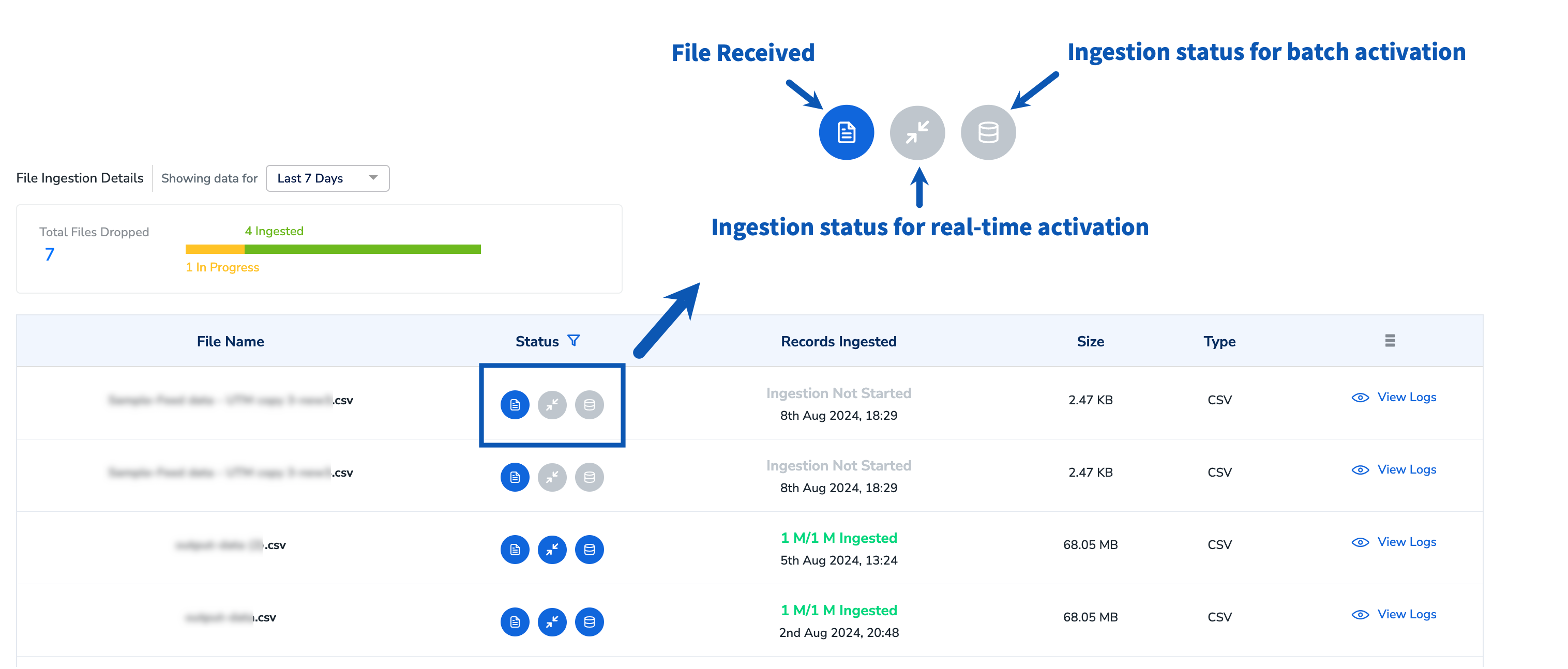 (14-8-2024) We have enhanced the source report to show file-level records ingestion status at a more granular level. This update informs users when an in-progress file is ready for real-time activation, which is an intermediate state before the file moves for batch activation. To learn more about this update, refer here.