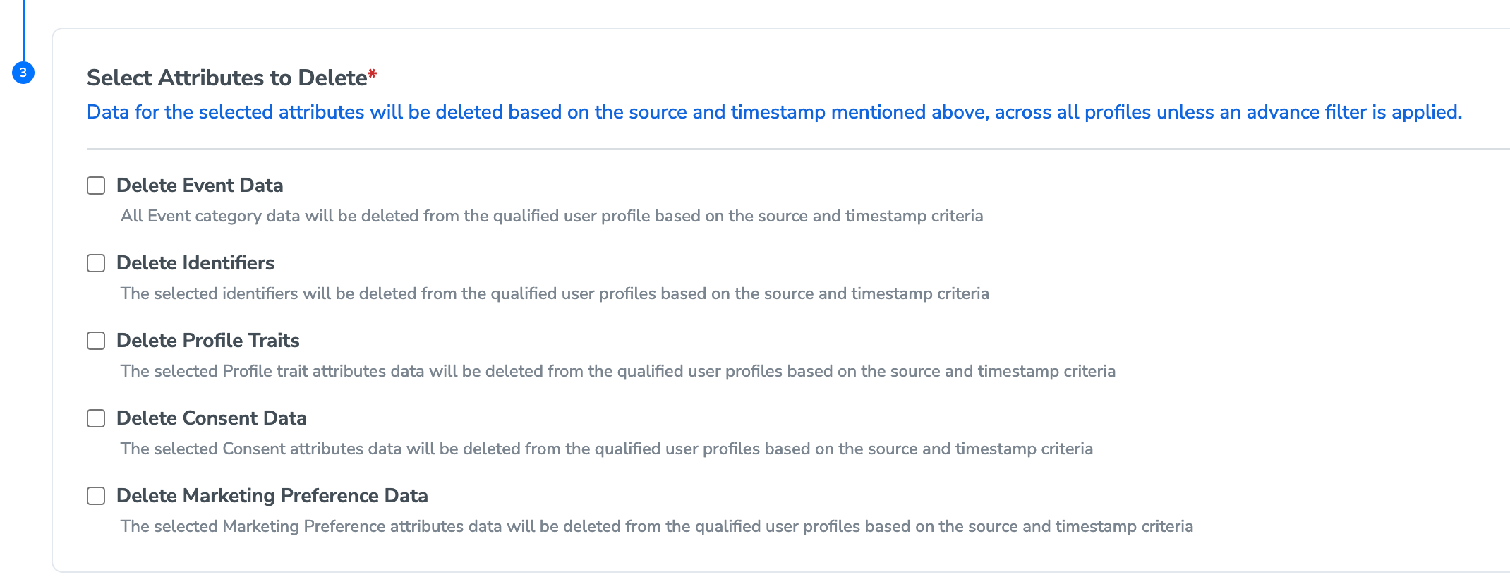 Note:Currently, if you select a particular source in the deletion rule, only event data is deleted. Identifiers, profile attributes, marketing preferences, and consent data remain in the system, as the system cannot determine whether the selected attributes for deletion were updated or ingested by the chosen source.If you select All Sources, you can delete all attribute types.