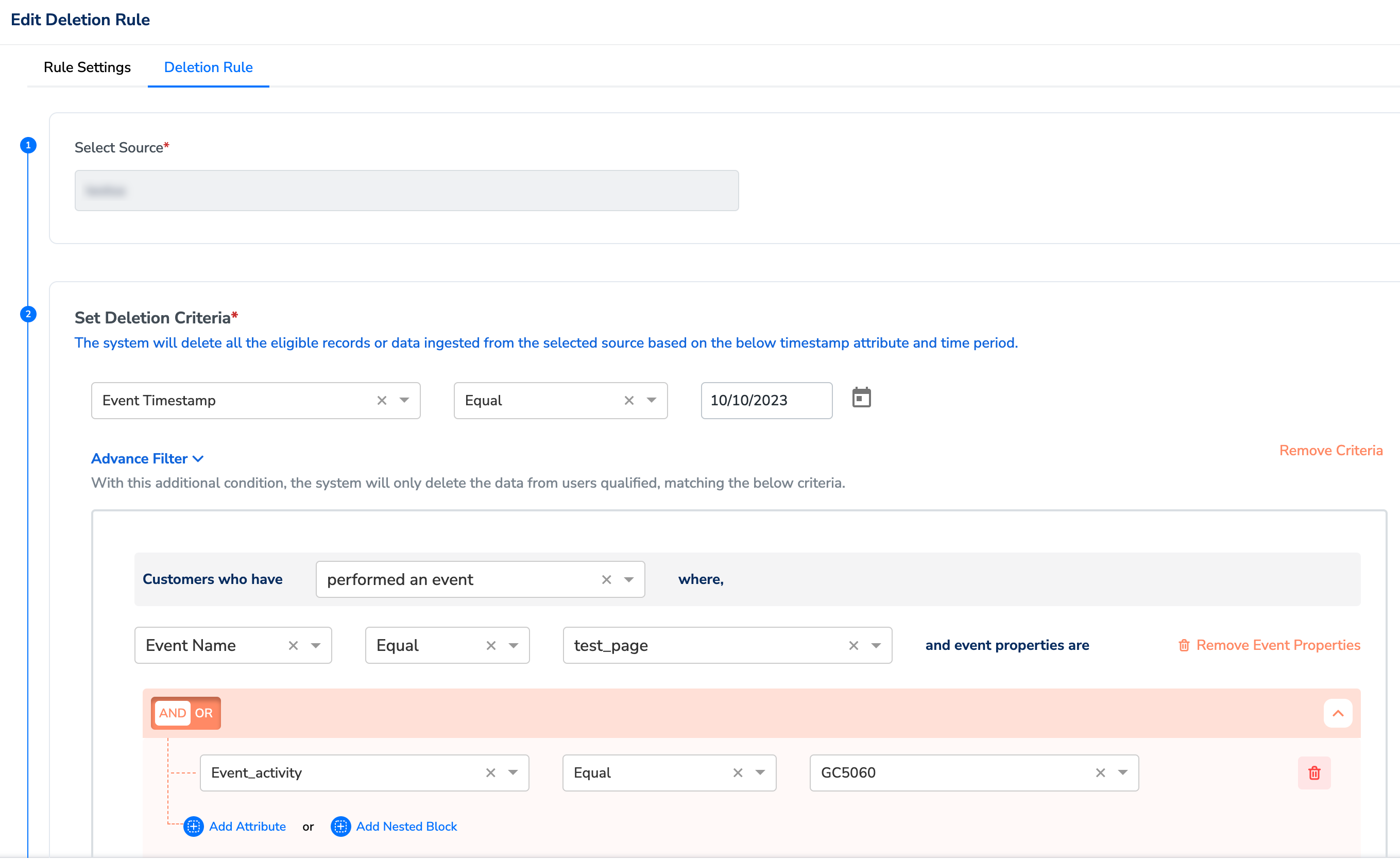 - Delete Event Data - Select this option to delete event data for qualified users based on the source and timestamp criteria. If you select “All Sources” under the “Select Source” field, then you will not be allowed to set up the deletion rule as this rule will delete your complete event store. Only after adding an advance filter, you can execute with the deletion rule.