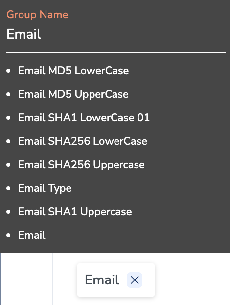 - Delete Identifiers - Select this option to delete specific identifiers for qualified users based on the source and timestamp criteria. Enter the identifier in the provided textbox. The qualified identifiers will be removed and will no longer be available for activation. For any selected identifier, all attributes within its group will also be selected for deletion, as shown in the image below. Hover over the selected Identifier group for the expanded view. Note that identifiers will only be deleted if you select ” All Sources” under the “Select Source” field. Learn more