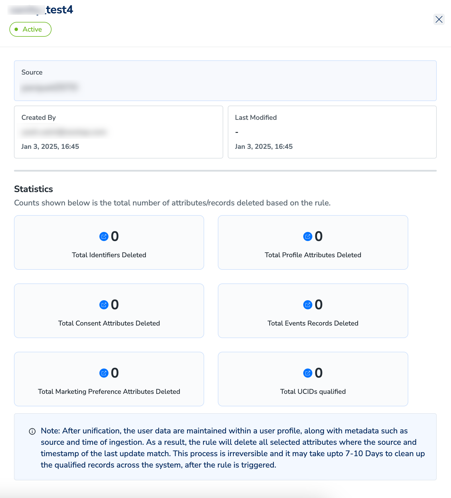 - View Insights – Use this option to access details about the deletion rule, including the selected source, creator, and last modified timestamp. View statistics such as the total records deleted under identifiers, profile attributes, consent attributes, events, and marketing preferences. You can also view the total number of UCIDs that qualified for the rule.
